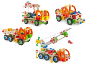 Drevená stavebnica pracovné stroje Constructor Tool Box Eichhorn autožeriav džíp nákladné auto a služobné auto 170 dielov od 6 rokov
