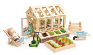 Drevený skleník Greenhouse and Garden Set Tender Leaf Toys s otváracou strechou a 9 druhov zeleniny pre bábiku