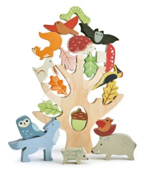Drevený strom s rovnováhou Stacking Forest Tender Leaf Toys s 19 zvieratkami a lesnými plodmi od 18 mes