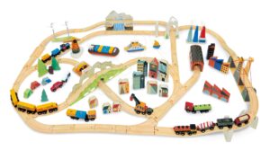 Drevená vláčikodráha vysokohorská Mountain View Train Set Tender Leaf Toys cesta okolo sveta cez mesta a hory 58 dielov a doplnky