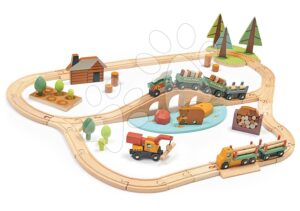 Drevená vláčikodráha v borovicovom lese Wild Pines Train set Tender Leaf Toys s vlakom a autami zvieratká s prírodou