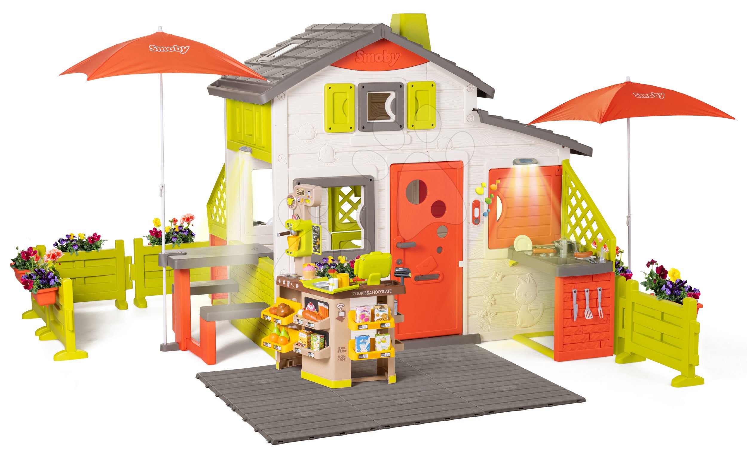 Domček Neo Friends House DeLuxe Smoby s Bio kaviarňou a kuchynka s jedálenským kútikom pod slnečníkmi