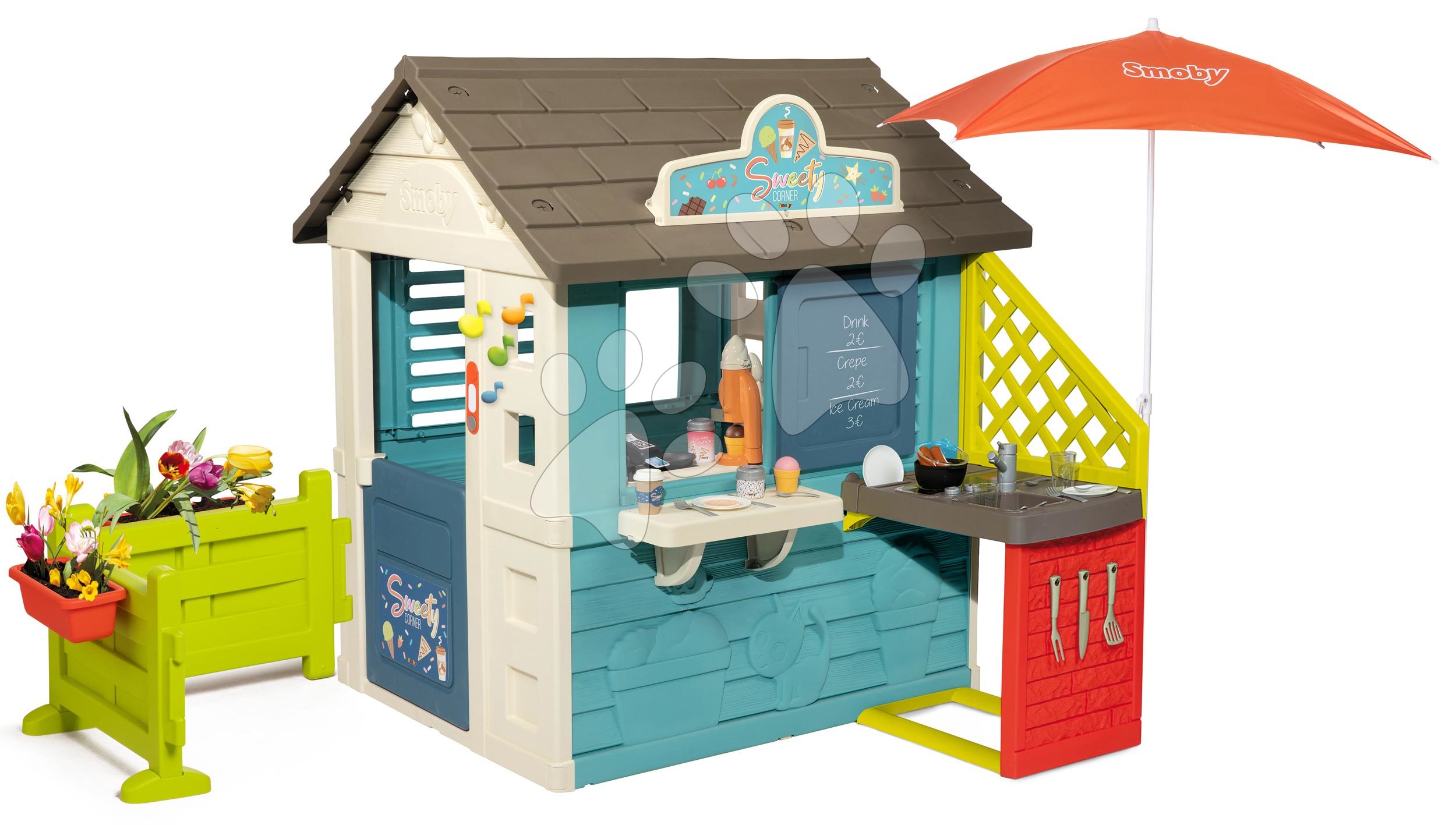 Domček s obchodom Sweety Corner Playhouse od francúzskeho výrobcu Smoby predstavuje skvelý darček pre všetkých chlapcov a dievčatá už od 2 rokov. V prednej časti domčeka sa nachádzajú polovičné dvere a elektronický zvonček, bočné steny sú vybavené 2 oknami so žalúziou a 1 posuvnou okenicou. Záhradku s plotom a 2 kvetináčmi si môžu deti umiestniť kdekoľvek pri domčeku a naučia sa pestovať kvetinky. Pred silnými slnečnými lúčmi deti ochráni slnečník Sunshade s nastaviteľnou výškou od 105 do 155 cm.