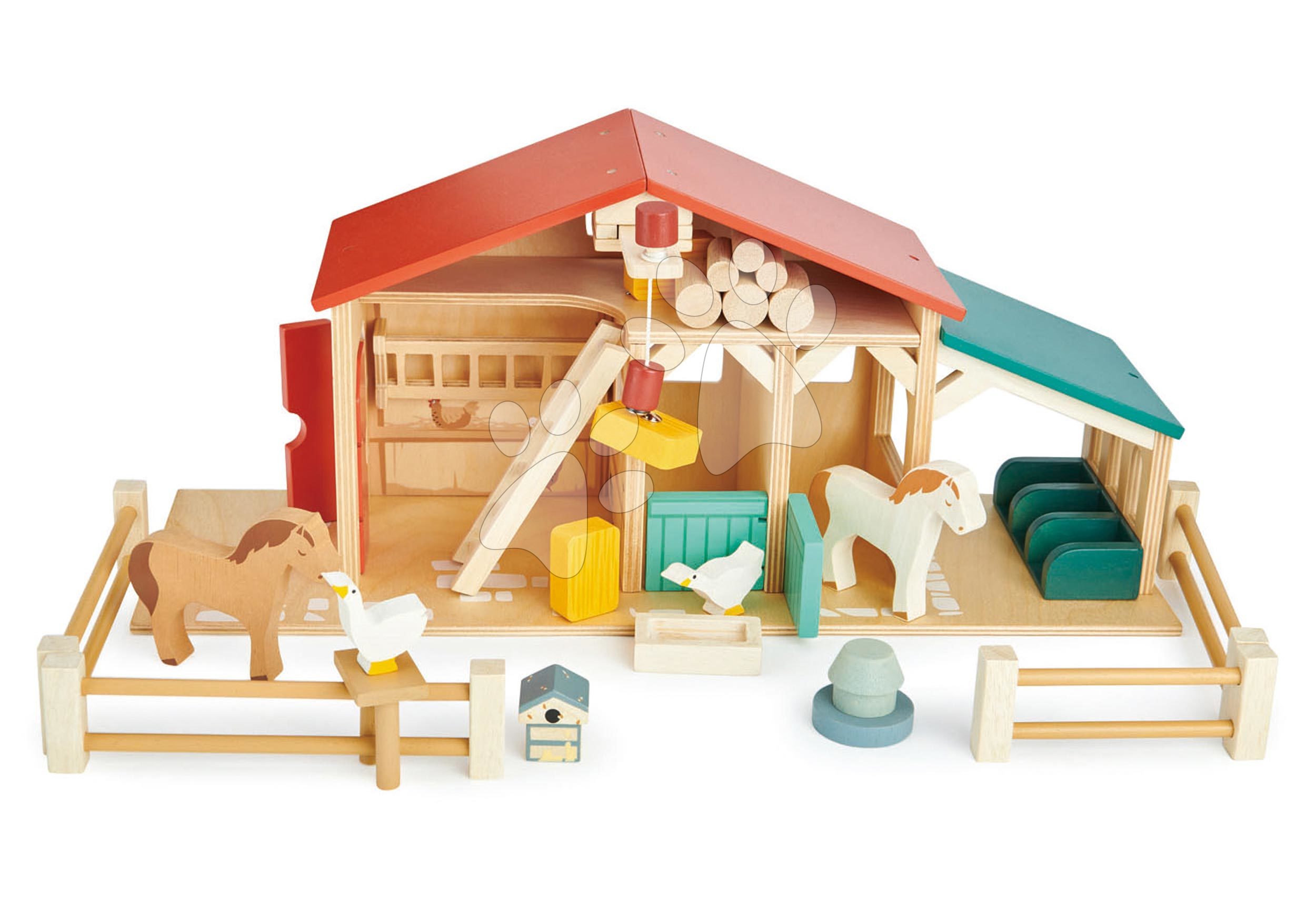 Drevená farma s ohradou od popredných dizajnérov značky Tender Leaf Toys bola navrhnutá vo Veľkej Británii a je skvelým darčekom pre všetky deti od 3 rokov. Tradičná drevená farma v britskom štýle si získa chlapcov a dievčatá, tešiť sa môžu na stajňu pre koníkov s otvárateľnými dvierkami, chlievik s krmnými válovmi, rebrík na povalu s balíkmi sena, kladkový systém s magnetickým ukončením na dvíhanie balíkov sena, 4 drevené ploty, 3 balíky sena, 2 husi, 2 koníky, válov na zrno, úľ a 6 drevených brvien. Deti sa naučia hravým spôsobom starať o vlastnú farmu, kŕmia zvieratká, udržujú poriadok a zvykajú si na každodennú prácu farmárov a chovateľov hospodárskych zvierat. Farma sa dá kedykoľvek rozšíriť o ďalšie drevené zvieratká, ktoré nájdete v našej ponuke.