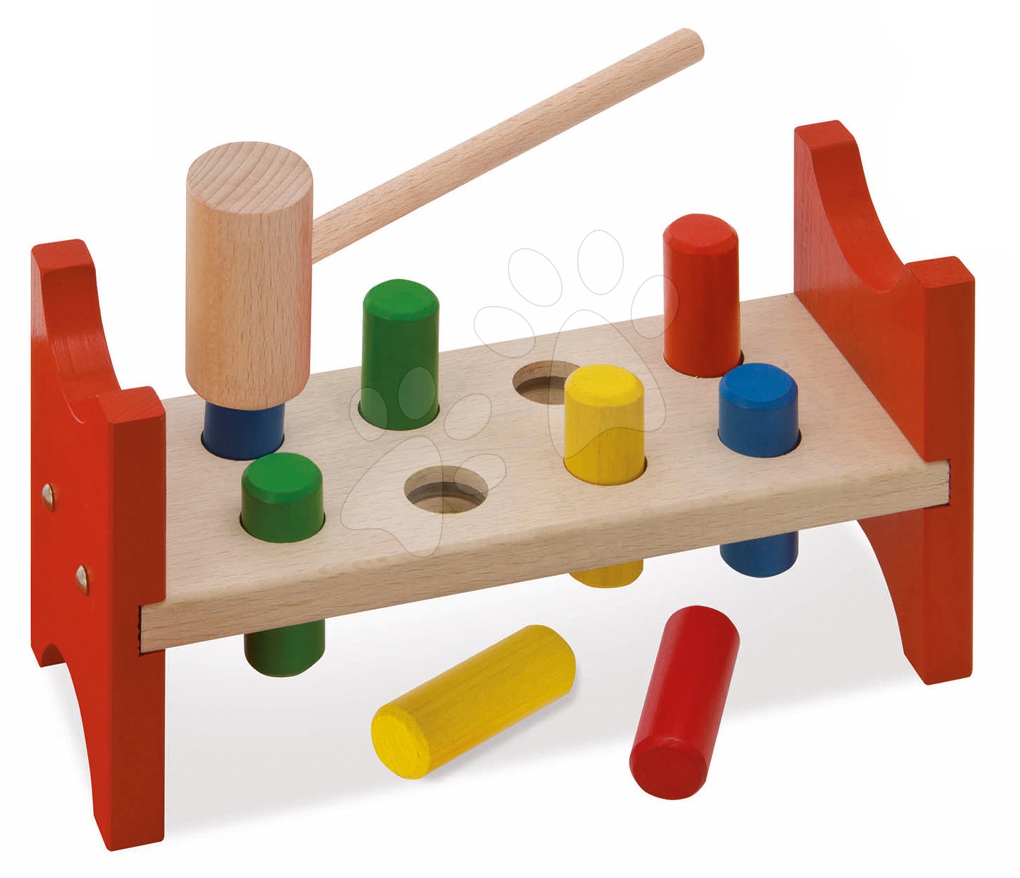 Hračky pre najmenších sú dôležité pre vývin každého dieťaťa, zvyšujú aktivitu ich mozgu, zlepšujú kognitívne schopnosti a zručnosti. Zatĺkacia hračka je vyhotovená v kombinácii prírodnej a sýtej červenej farby, ktoré pomôžu deťom lepšie rozlišovať farby. Pri zatĺkaní valcov sa naučia rýchlo odhadovať správny sklon a silu úderu. Takýmto spôsobom naberajú získavajú zdravé sebavedomie, učia sa na seba spoľahnúť a rýchlejšie riešia akékoľvek úlohy. Pri výrobe a spracovaní dreva sa dodržiavali najvyššie štandardy kvality, hračka spĺňa aj prísne kritériá kvality, je bezpečná pre hru najmenších detí. Rozmery produktu sú 9*13*24 cm.
