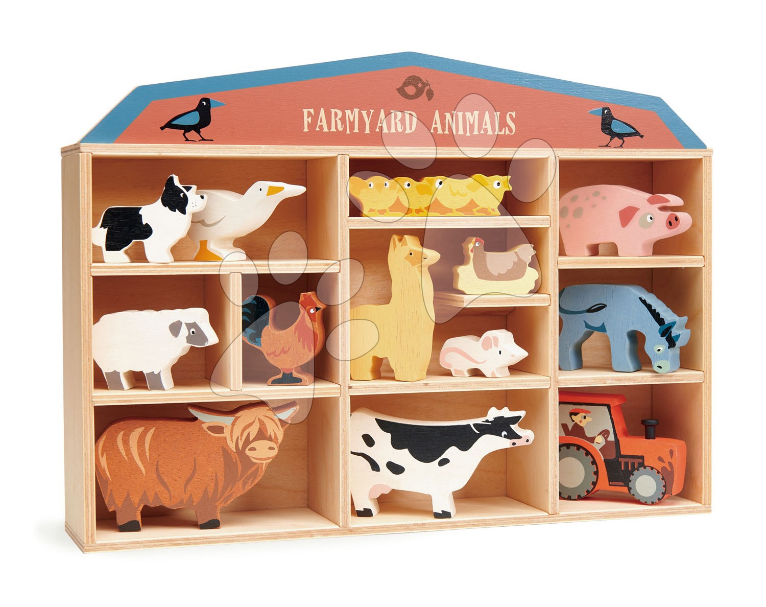 Drevené domáce zvieratká na poličke Farmyard nádherná sada drevených zvieratiek pre deti od 3 rokov, ktorá ozdobí každú detskú izbičku, a s ktorou sa zahrajú každý deň. Sadu domácich zvieratiek navrhli poprední dizajnéri značky Tender Leaf Toys priamo vo Veľkej Británii a vyznačuje sa pravým britským vzhľadom. Deti sa môžu tešiť na krásne maľované zvieratká, typické pre Veľkú Britániu, medzi ktorými nájdu kravičku, psíka, kačičku, kohúta, ovečku, sliepočku, lamu, myšku, kuriatka, oslíka, prasiatko, zubra a nechýba ani traktor, takže sa deti zabavia pri hre na farmárov a chovateľov zvierat. Figúrky si môžu po hre uložiť do krásnej poličky s 10 priehradkami, ktorá je zdobená lesným motívom a nápisom Farmyard Animals.