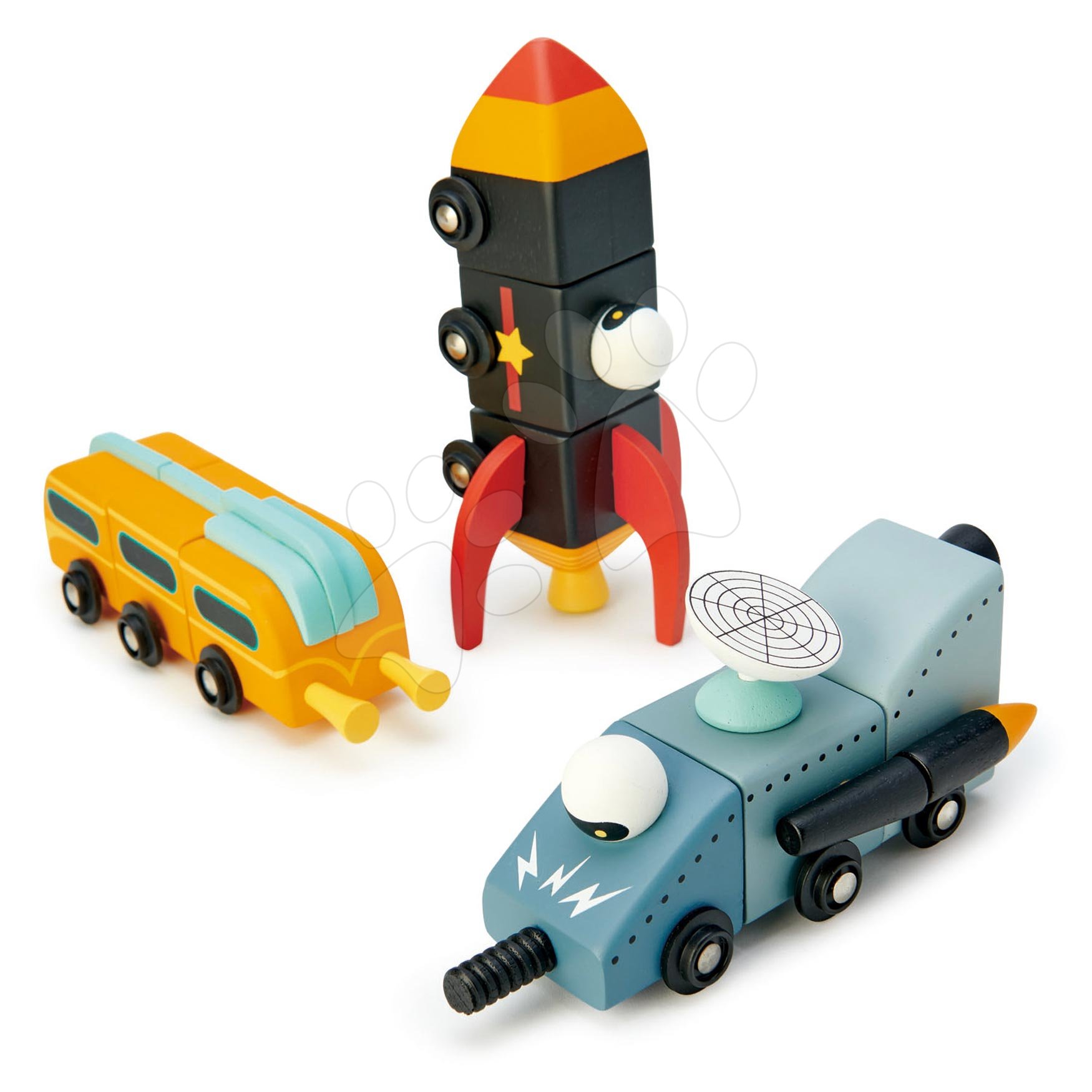 Nádherné sýte farby a pravý britský dizajn na drevenej súprave podnecuje rozvoj fantázie a kreativity, prebúdzajú zdravú detskú zvedavosť. Dieťa sa začne zaujímať o vesmír, bude sa pripravovať na povolanie kozmonauta alebo konštruktéra vesmírnych vozidiel a spolu so svojimi súrodencami a kamarátmi budú vymýšľať príbehy o letoch do vesmíru. Jednotlivé dieliky sú navzájom kombinovateľné, dieťa si môže vytvoriť svoj vlastný typ vesmírneho autíčka. Drevené skladacie autá sú produktom najvyššej kvality, ktorý vytvorí pri hre neopakovateľnú atmosféru, pričom si deti zlepšujú jemnú motoriku a technickú predstavivosť.