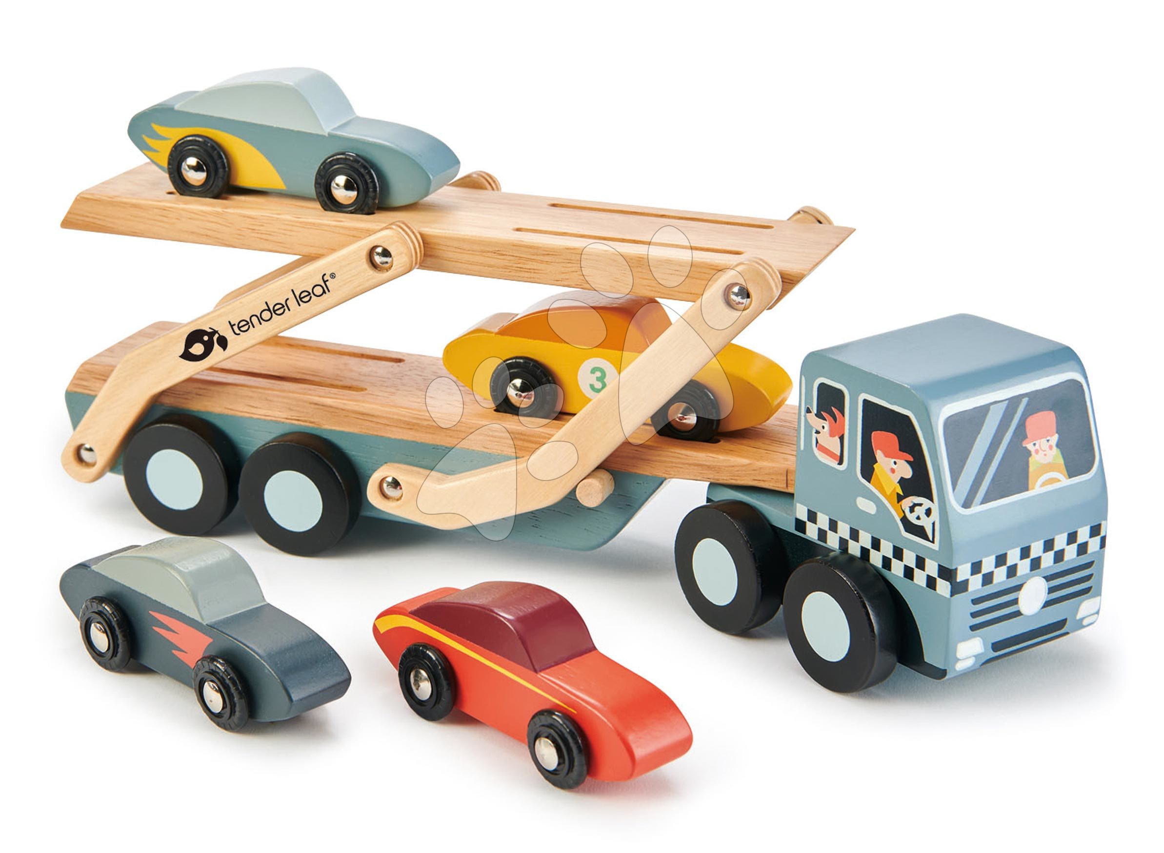 Drevený kamión Car Transporter predstavuje fantastický darček pre všetky deti a najmä chlapcov od 3 rokov. Nadčasová 5-dielna sada obsahuje šedý ťahač s pohyblivou dvojposchodovou plošinou, na ktorej dokáže previezť naraz až 4 pretekárske autíčka. Deti si s nimi užijú veľa radostných chvíľ, rýchlo sa naučia používať plošinu tak, aby umožnili vozidlám jednoduchý nájazd a výjazd. Vynikajúci kamión z prvotriedneho dreva a sadu autíčok navrhli poprední dizajnéri Tender Leaf Toys priamo vo Veľkej Británii a na výrobe sa podieľali skúsení remeselníci.