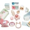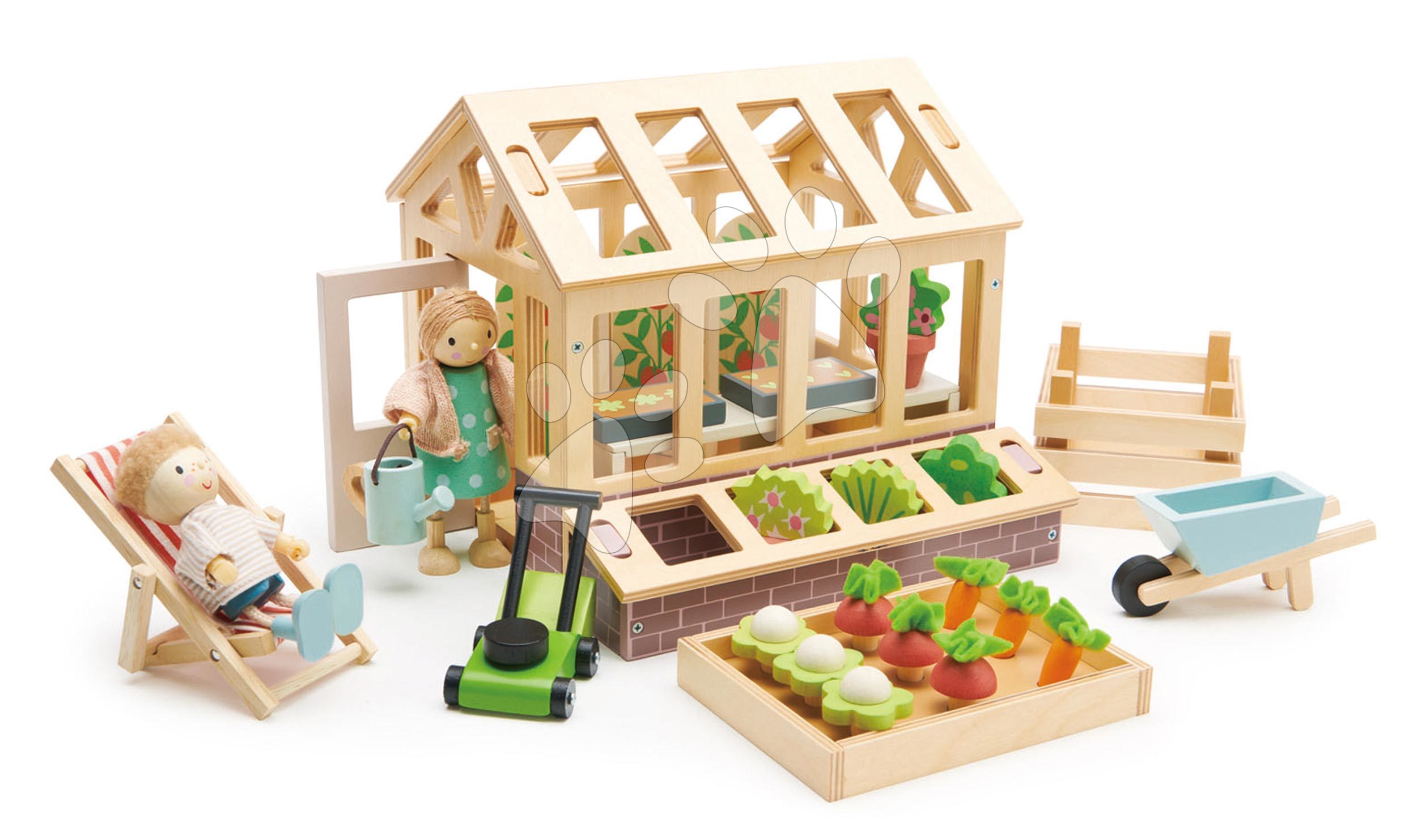 Drevený skleník Greenhouse and Garden Set od popredných dizajnérov značky Tender Leaf Toys bol navrhnutý vo Veľkej Británii a je skvelým darčekom pre všetky deti od 3 rokov. Tradičný skleník z prvotriedneho dreva je skvelým rozšírením k detským domčekom, ale dá sa s ním hrať aj samostatne. Skleník je vybavený otvárateľnými dvierkami a 2 odnímateľnými strešnými panelmi. Chlapci a dievčatá doň ľahko vložia priehradky na sadenie, stolík na presádzanie, 4 kvetináče s rastlinkami a 3 rajčinové kríčky. Súčasťou drevenej sady je aj forma pre vyklíčenie semienok, forma pre rast 9 druhov zeleniny, ohrádka pre kompost, zelená kosačka, krhlička, stromček, fúrik a skladacie sedadlo s pásikavou textíliou, v ktorom si bábika vychutná plody zo svojej záhradky (bábiky nie sú súčasťou balenia).