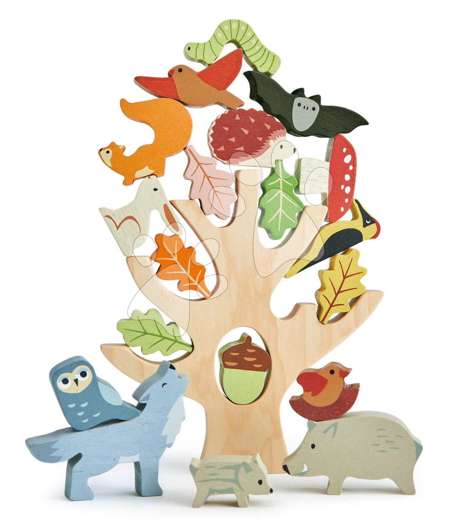 Drevený strom s rovnováhou Stacking Forest predstavuje vynikajúcu didaktickú hračku pre všetky deti už od 18 mesiacov. Bohatá 19–dielna sada obsahuje štýlový stromček z prvotriedneho dreva, ktorý sa detičky snažia opatrne ozdobiť s krásne farebnými figúrkami, medzi ktorými nájdu sovičku, netopiera, veveričku, ďatľa, žaľuď, 5 lístočkov, húseničku, muchotrávku, zajačika, ježka, vtáčika a hniezdo s vtáčikom. Pod stromček môže poukladať figúrku sivého vĺčika a diviačicu s mláďatkom. Deti si pri skladaní zvieratiek precvičia jemnú motoriku, hľadajú správnu rovnováhu pre každú figúrku, sústredia sa na detail. Drevené zvieratká navrhli poprední dizajnéri Tender Leaf Toys priamo vo Veľkej Británii a na výrobe sa podieľali zruční remeselníci.
