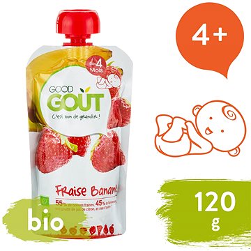 Príkrm Good Gout BIO Jahoda s banánom (120 g):Ovocný príkrm Good Gout ukrytý v praktickom vrecúšku ponúka dokonale lahodnú kombináciu odrody jabĺk Gala spoločne s banánmi a s kvapkou citróna. Deti zasýti a skutočne skvele chutí a vy si tak môžete byť istí, že im doprajete to najlepšie vo forme 100 % ovocia v bio kvalite. Vrecúško je ideálne ako desiata na prechádzku, výlet alebo návštevu blízkej rodiny či priateľov, aby ste ho mali pripravené vždy, keď vaše dieťa vyhladne. Táto detská výživa od ukončeného 4. mesiaca je bez lepku a obsahuje len prirodzene sa vyskytujúce cukry. Praktické balenie príkrmu Good Gout umožňuje, aby staršie dieťaťa jedlo samo bez toho, aby sa zašpinilo. Menším deťom stačí porciu vyliať do misky a ľahko nakŕmiť lyžičkou.Kľúčové vlastnosti ovocného príkrmu Good Gout BIO Jablko s banánom (120 g)Ovocný príkrm Good Gout ukrytý v praktickom vrecúškuPonúka 100 % ovocie v bio kvaliteKombinácia odrody jabĺk Gala spoločne s banánmi a s kvapkou citrónaVrecúško deti zasýti a skutočne skvele chutíIdeálna desiata so sebou na prechádzku, výlet, či na návštevu k blízkymVhodné od ukončeného 4. mesiacaBez obsahu lepku a s len prirodzene sa vyskytujúcimi cukramiPraktické balenie umožňuje aby staršie dieťa jedlo samoMenším deťom stačí porciu vyliať do misky a ľahko nakŕmiť lyžičkouZloženie: 55 % bio jablka Gala, 45 % bio banány, koncentrovaná šťava z bio citrónov Výživové údaje na 100 g: Energia: 237 kJ/56 kcalTuky: 0,2 g– z toho nasýtené mastné kyseliny 0,1 gSacharidy: 12 g– z toho cukry: 10 gVláknina: 1,7 gBielkoviny: 0,7 gSoľ: 0 g