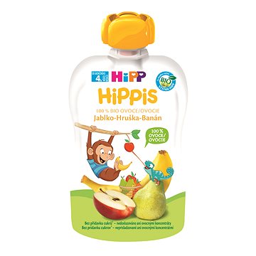 Príkrm HiPP BIO 100% ovocie Jablko-Hruška-Banán od uk. 4. mesiaca 100 g:Vrecúško HiPPiS značky HiPP s príchuťou jablka, hrušky a banánu je vyrobené zo 100 % ovocia, ktoré je prísne kontrolované. Spracovávané je len ovocie s nízkym obsahom kyselín a to, čo celkom a prirodzene dozrelo. Vďaka tomu je ovocie v BIO kvalite a nie je k nemu potrebné pridávať ani cukor ani žiadne arómy. Ovocný príkrm značky HiPP je vhodný pre deti od ukončeného štvrtého mesiaca a vďaka praktickému baleniu vo vrecúšku si ho vaše dieťa môže pohodlne vychutnať kdekoľvek. Dieťa si vrecúško HiPPiS môže držať samo, alebo mu príkrm môžete podávať na lyžičke, či tanieriku podľa veku dieťaťa.Kľúčové vlastnosti ovocného príkrmu HiPP BIO 100 % ovocia Jablko-Hruška-Banán od ukončeného štvrtého mesiaca, 100 gOvocný príkrm vo vrecúšku značky HiPPPre deti od ukončeného štvrtého mesiacaS príchuťou jablká, hrušky a banánuVrecúško HiPPiS je ideálne na cestovanie, či rýchlu desiatuBez aróm, lepku a s iba prirodzene sa vyskytujúcimi cukramiJemné pyré zo 100 % ovocia v BIO kvalite Zloženie: 100 % ovocia (jablká 40 %, hrušky 40 %, banán 20 %).Výživové hodnoty: Energetická hodnota: 60 kcal/253 kJ Tuky: 0,25 g Sacharidy: 12,9 g – z toho cukry: 11,3 g Vláknina: 2,2 g Bielkoviny: 0,5 g Soľ: <0,05 g