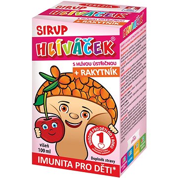 Doplnok stravy HLÍVÁČEK sirup s hlivou a rakytníkom VIŠŇA 100 ml: 100 % prírodný doplnok stravy pre deti už od 1 roku (posúdené Českou pediatrickou spoločnosťou), hliva s deklarovaným obsahom betaglukánov – 118,2 mg v jednej lyžičke, rakytník na podporu imunity, bez pridaných farbív, konzervačných látok a sladidiel. Zloženie100 % jablčný koncentrát, fruktózový sirup, 100 % višňový koncentrát (13 %), 100 % prášok hlivy ustricovej (Pleurotus ostreatus), sušená rakytníková šťava (Hippophae rhamnoides). DávkovanieDETI 1 – 3 ROKY1× denne 1 čajová lyžička pred jedlom. DETI OD 3 ROKOV2× denne 1 čajová lyžička pred jedlom. Sirup je možné konzumovať neriedený, alebo sa naleje do vody, alebo do jogurtu. Môže sa užívať dlhodobo.