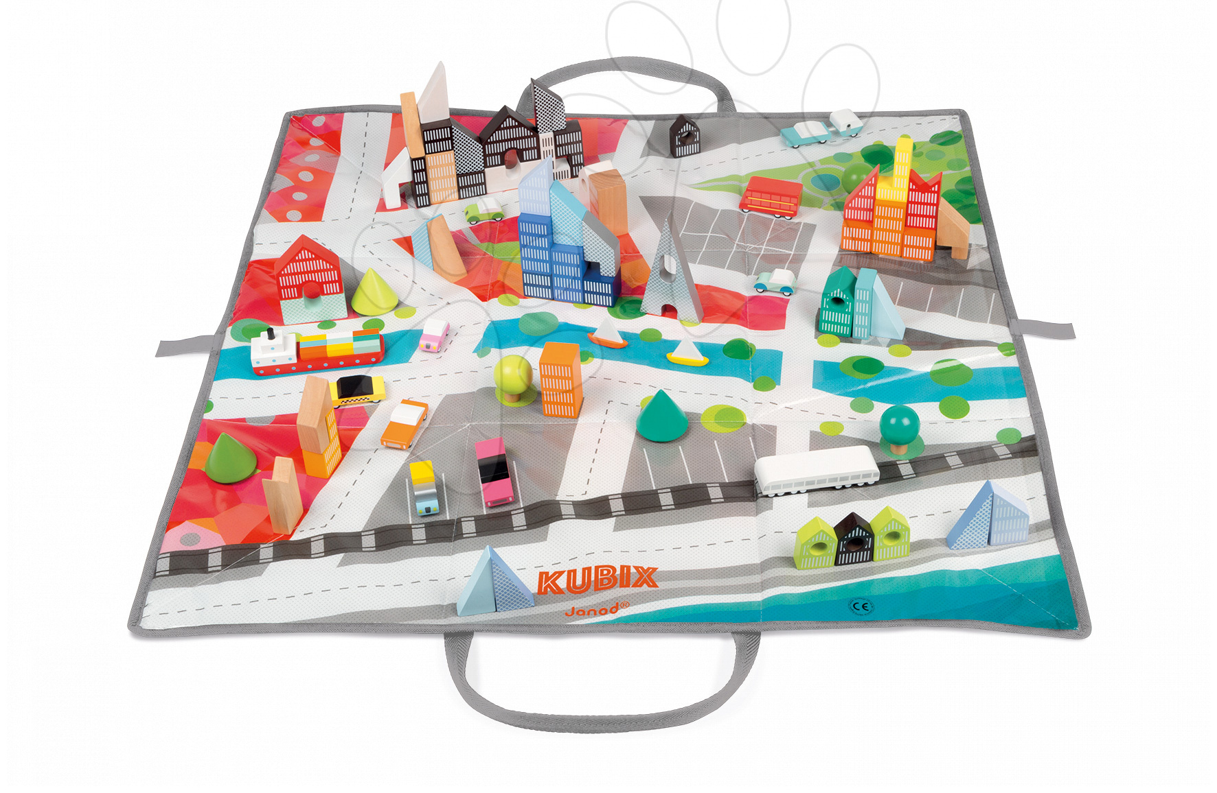 Drevené kocky na podložke Mesto Kubix Janod sú pekná drevená hračka vhodná pre deti od 3 do 6 rokov. Drevená stavebnica pozostáva až zo 70 rôznych kociek v odlišných tvaroch a farbách a obojstrannej podložky. Deti sa môžu hrať na vodičov autíčok, stavbárov alebo dopravných policajtov. Textilná podložka, na ktorej sú zobrazené cesty, rieky, parky, budovy, parkoviská, stromy a železnica pripomína naozajstné mesto.