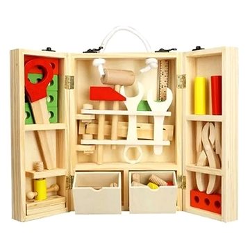 Detské náradie Náradie drevo 30 ks v drevenom kufríku: Chcete potešiť svojho malého domáceho majstra a hľadáte vhodnú hračku do jeho zbierky? Predstavujeme vám kvalitný otvárací drevený kufrík s priehradkami a farebným náradím. Súčasťou je napríklad skrutkovač, kladivko, kľúč, matice, skrutky a množstvo ďalších doplnkov. Chlapci proste milujú, keď môžu niečo opravovať. Herná sada je ideálna na záhradu alebo do detskej izbičky a vyniká jednoduchou manipuláciou. Vďaka ľahkému zloženiu je kufrík skladný a nezaberie veľa miesta. Kľúčové vlastnosti náradia v drevenom kufríku, 30 ksNáradie v drevenom kufríku je vhodné pre deti od 3 rokovOtvárací kufrík s priehradkami a farebným náradímSúčasťou je skrutkovač, kladivko, kľúč, matice, skrutky a ďalšie doplnkyRozvíja jemnú motoriku a technické myslenieIdeálne na záhradu či do detskej izbyVyrobené z dreva, ľahká manipulácia