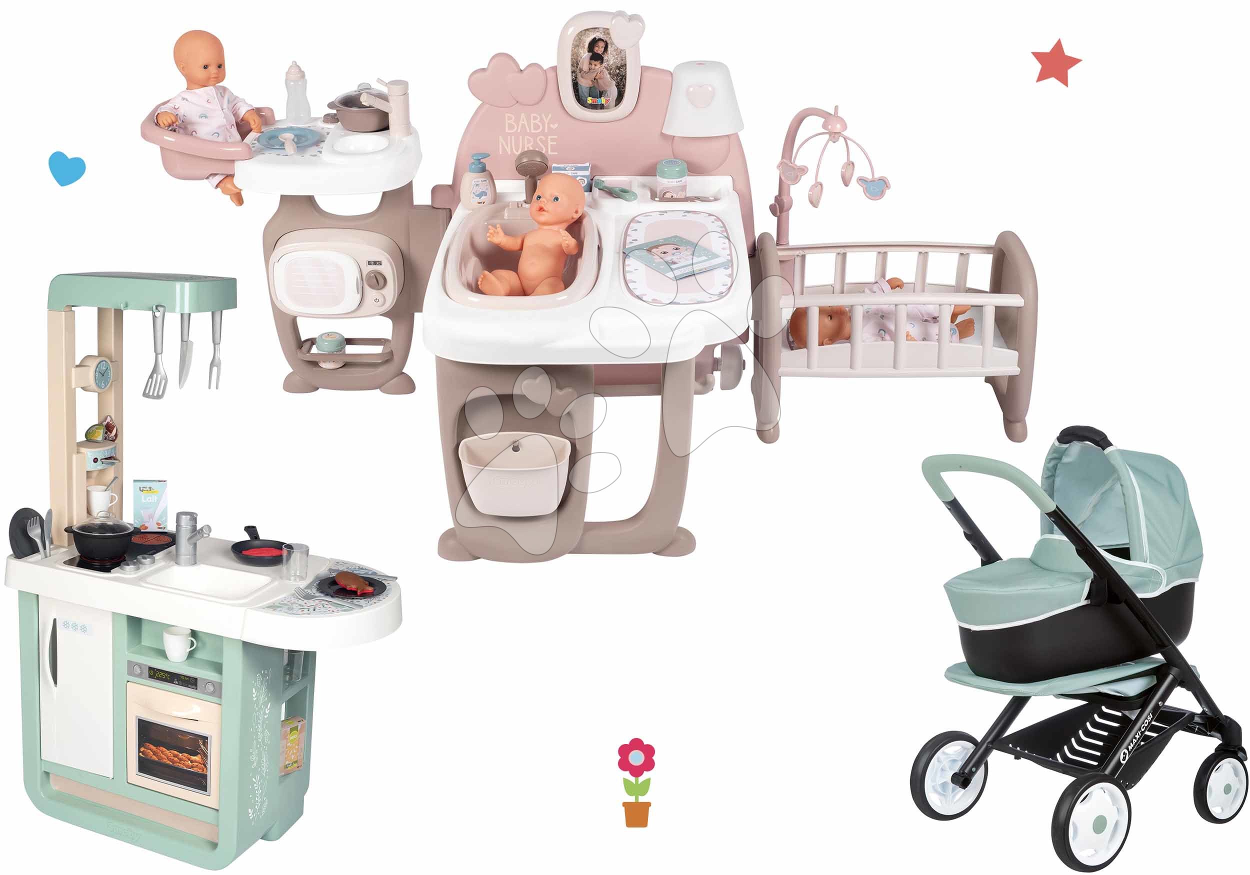 Set domček pre bábiku Large Doll’s Play Center Natur D’Amour Baby Nurse Smoby a kuchynka elektronická a kočík trojkombinácia Maxi Cosi