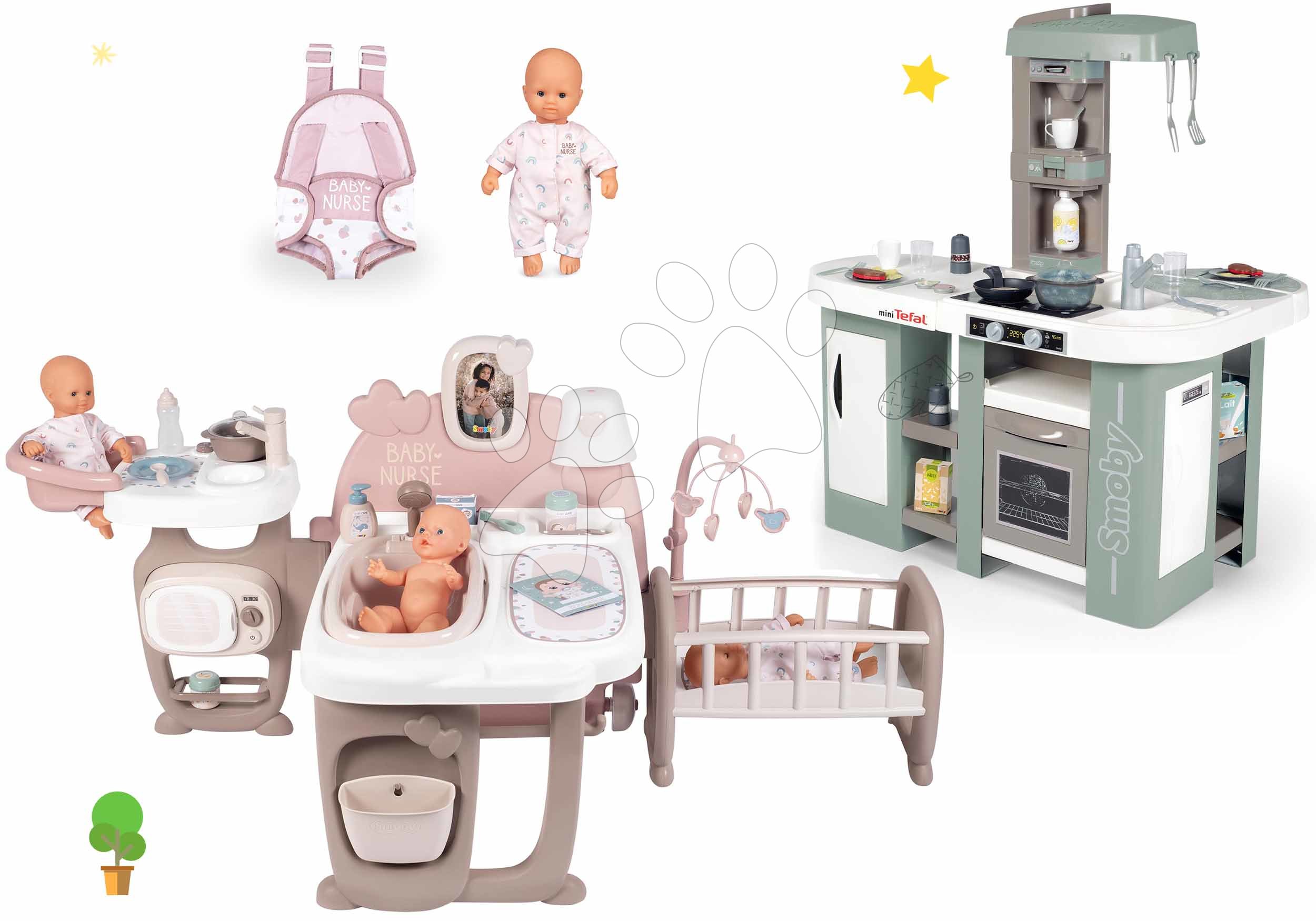 Set domček pre bábiku Large Doll’s Play Center Natur D’Amour Baby Nurse Smoby a kuchynka s magickým bublaním a klokanka s 32 cm bábikou