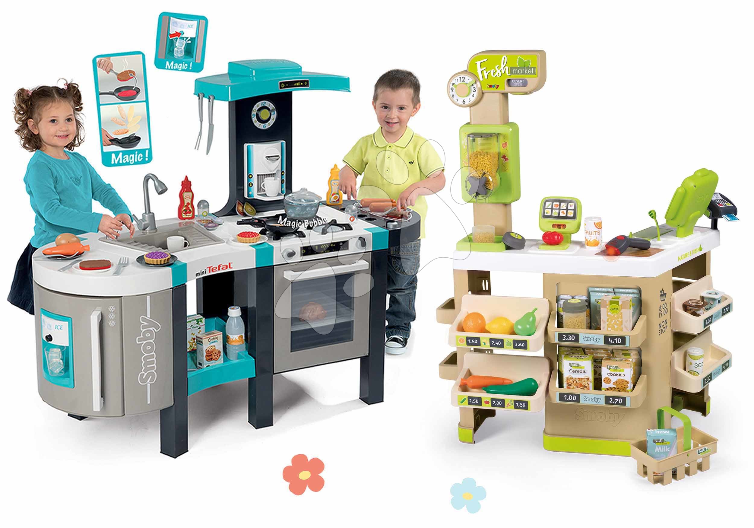 Set kuchynka elektronická a Bio obchod Tefal French Touch Bubble Smoby s magickým bublaním a svetlom a dávkovačom cereálií