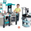 Elektronická kuchynka pre deti Tefal French Bubble Smoby sa so svojimi 46 doplnkami radí medzi špičkové detské kuchynky a obľúbi si ju každé dieťa od 3 rokov. Tyrkysovo-šedá kuchynka má moderný a elegantným vzhľad, vďaka ktorému sa bude dokonale hodiť do každej detskej izby. Bohatá výbava 46 doplnkov obsahuje príbory, tanieriky, soľničku, koreničku, fľašku kečupu a majonézy, fľašu na vodu, poháriky s tanierikmi, repliky surovín a potravín. Vďaka tomu sa varenie a pečenie stane pre deti skutočným zážitkom, pričom sa môžu tešiť aj na otvárateľnú chladničku, mechanický dávkovač ľadu, rúru na pečenie, panvicu s funkciou otáčania palaciniek a magický hrniec s efektom bubliniek.