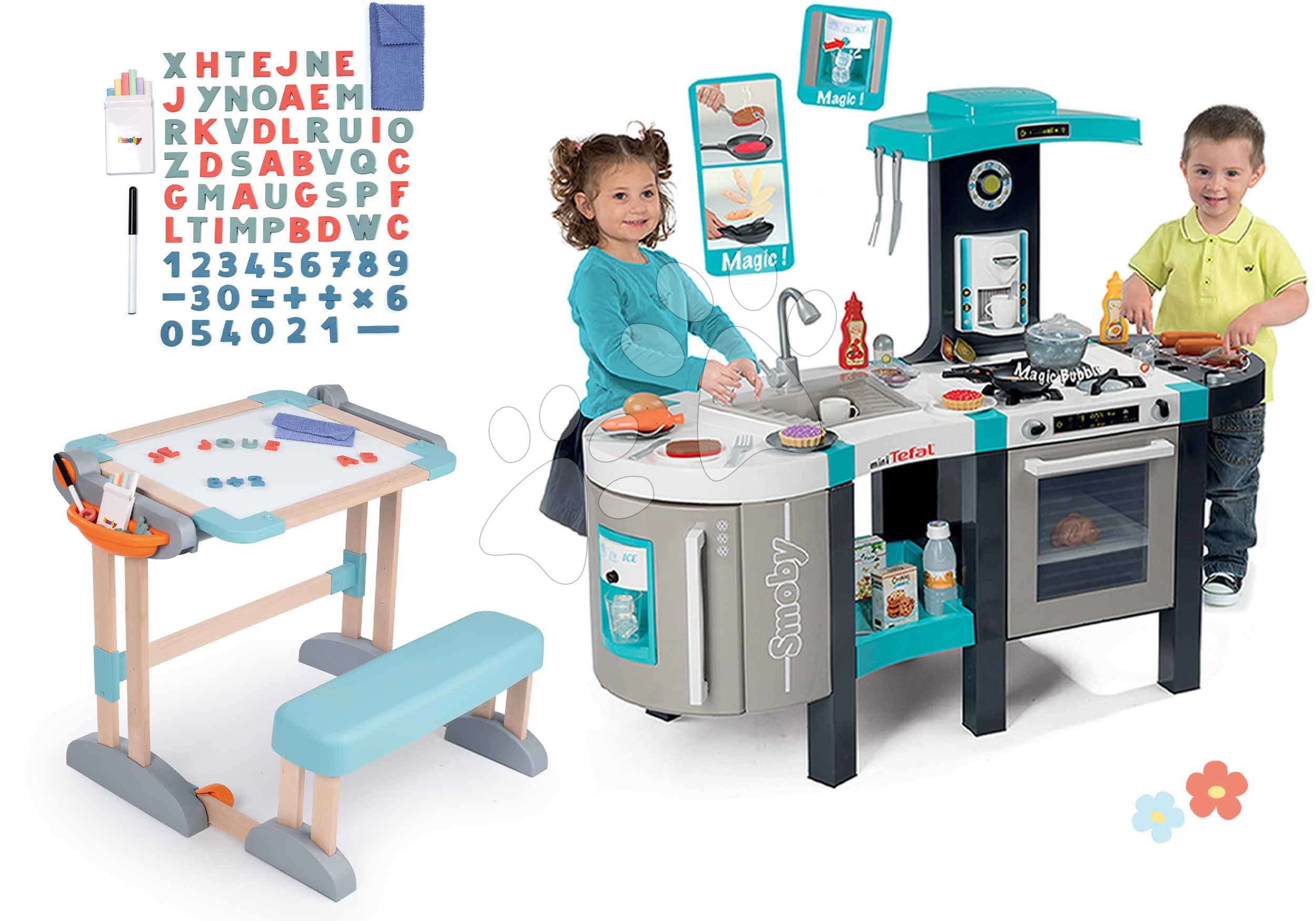 Elektronická kuchynka s bublaním a drevená lavica s písmenkami a číslami predstavujú skvelú sadu hračiek pre všetky deti od 3 rokov. Hračky v sete spolu dizajnovo ladia, vydržia vašim najmenším dlhé roky. S kuchynkou s magickým efektom bublania sa deti zahrajú na kuchárov a učia sa používať kuchynské spotrebiče, riady a príbory. Vďaka praktickej školskej lavici si vyskúšajú aj hru na učiteľov a žiakov, spoznávajú abecedu, čísla a vyskúšajú si prvé matematické príklady alebo sa učia kresliť. Deti pri hre získajú realistické zážitky, rozvíjajú si jemnú motoriku, logické myslenie a približujú sa svetu dospelých.