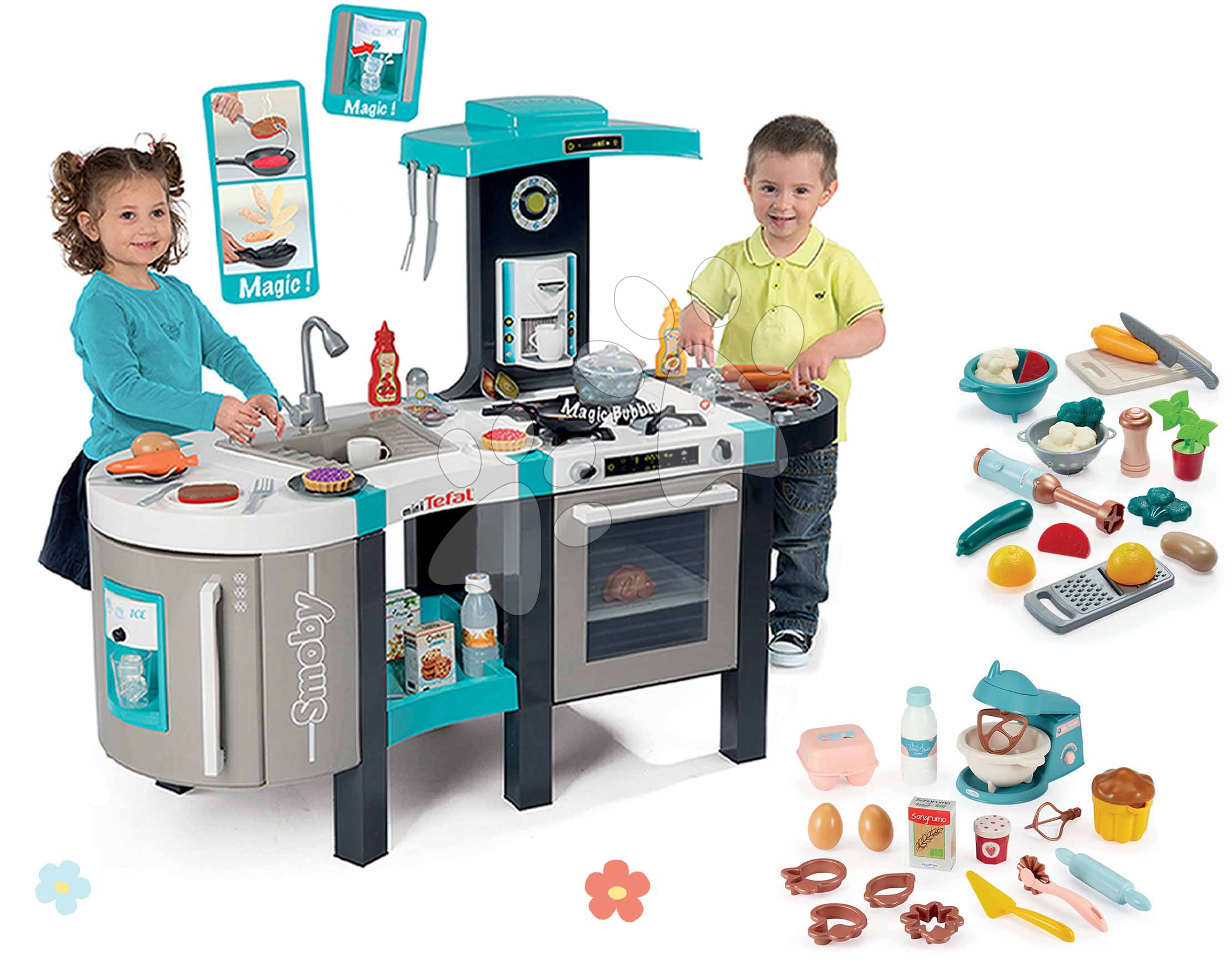 Elektronická kuchynka Tefal a kuchynská sada na varenie a pečenie predstavujú originálnu sadu hračiek pre deti od 3 rokov. Hračky od francúzskeho výrobcu Smoby a Écoiffier spolu dizajnovo a farebne ladia, vydržia vašim najmenším dlhé roky. S kuchynkou s efektom bublania sa zahrajú na kuchárov a objavujú, ako správne používať rôzne kuchynské spotrebiče. Pri varení a pečení budú mať k dispozícii kuchynskú sadu s mixérom a rôznymi potravinami, vďaka čomu zažijú ešte realistickejšie zážitky. Hravým spôsobom sa tak približujú svetu dospelých, rozvíjajú si logické myslenie a jemnú motoriku.
