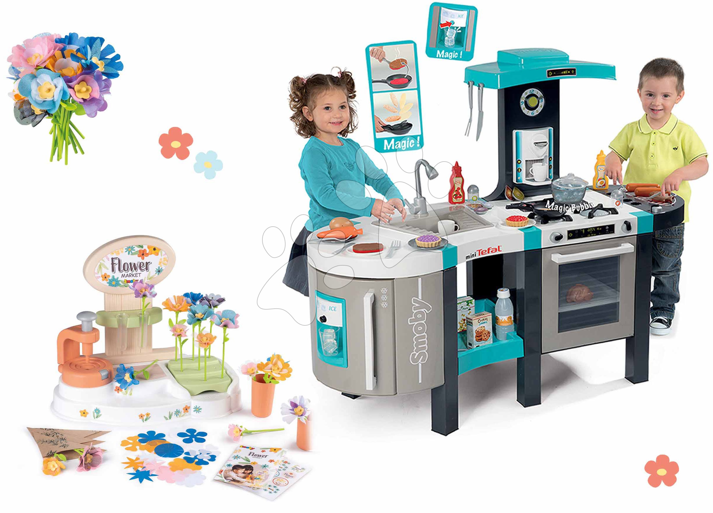Elektronická kuchynka Tefal a kvetinárstvo s výrobou kvetov a náhradným materiálom tvoria originálny set hračiek pre kreatívne deti od 3 rokov. Hračky spolu dizajnovo a farebne ladia, vydržia vašim najmenším dlhé roky. Deti si vyskúšajú hry na šéfkuchárov, učia sa variť s magickým bublajúcim hrncom a takisto si otvoria kvetinárstvo na výrobu ozdobných kvetov. Hravým spôsobom sa približujú svetu dospelých, rozvíjajú si jemnú motoriku, logické myslenie, učia sa improvizovať a objavia svoj umelecký talent. Set hračiek je vhodný aj pre hru viacerých detí, pričom si zlepšujú komunikačné schopnosti.