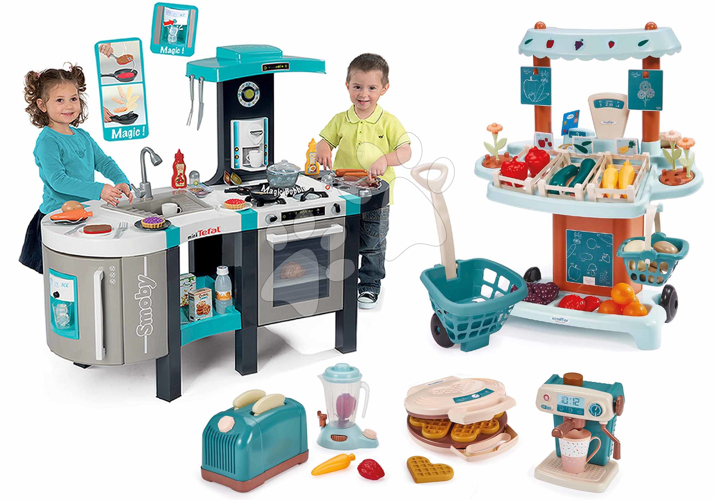 Elektronická kuchynka Tefal a zeleninový Bio stánok s kuchynskými spotrebičmi potešia všetky deti od 3 rokov, ktoré majú rady hry na povolania. Hračky od francúzskeho výrobcu Smoby a Écoiffier spolu dizajnovo a farebne ladia, vydržia vašim najmenším dlhé roky. S kuchynkou s efektom bublania sa zahrajú na kuchárov a objavujú, ako správne používať rôzne kuchynské spotrebiče. So zeleninovým stánkom si vyskúšajú svoje obchodné zručnosti, zahrajú sa hry na predavačov a zákazníkov. Hravým spôsobom sa tak približujú svetu dospelých, získajú realistické zážitky, rozvíjajú si logické myslenie a jemnú motoriku.