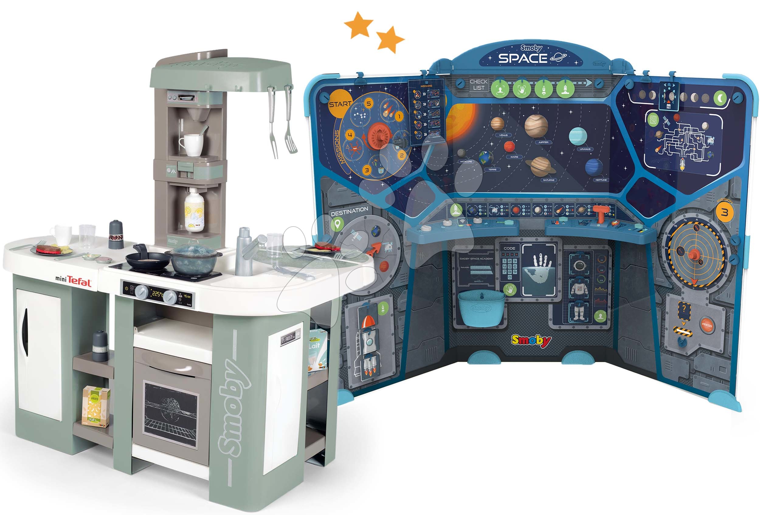 Kuchynka elektronická s bublaním Tefal XL Bubble a náučná hra o vesmíre Space Center predstavujú fantastickú súpravu hračiek pre deti už od 3 rokov. Hračky v sete spolu dizajnovo a farebne ladia, vydržia vašim najmenším dlhé roky. Dievčatá a chlapci si vyskúšajú hry na profesiu kuchárov, učia sa pripravovať chutné jedlo a taktiež zažijú skvelé vesmírne dobrodružstvo pri objavovaní okolitého vesmíru. Hravým spôsobom sa približujú svetu dospelých, získajú realistické zážitky, rozvíjajú si jemnú motoriku a logické myslenie. Set hračiek je vhodný aj pre viaceré deti, takže si zlepšujú komunikačné schopnosti a ľahšie si vytvárajú sociálne väzby.
