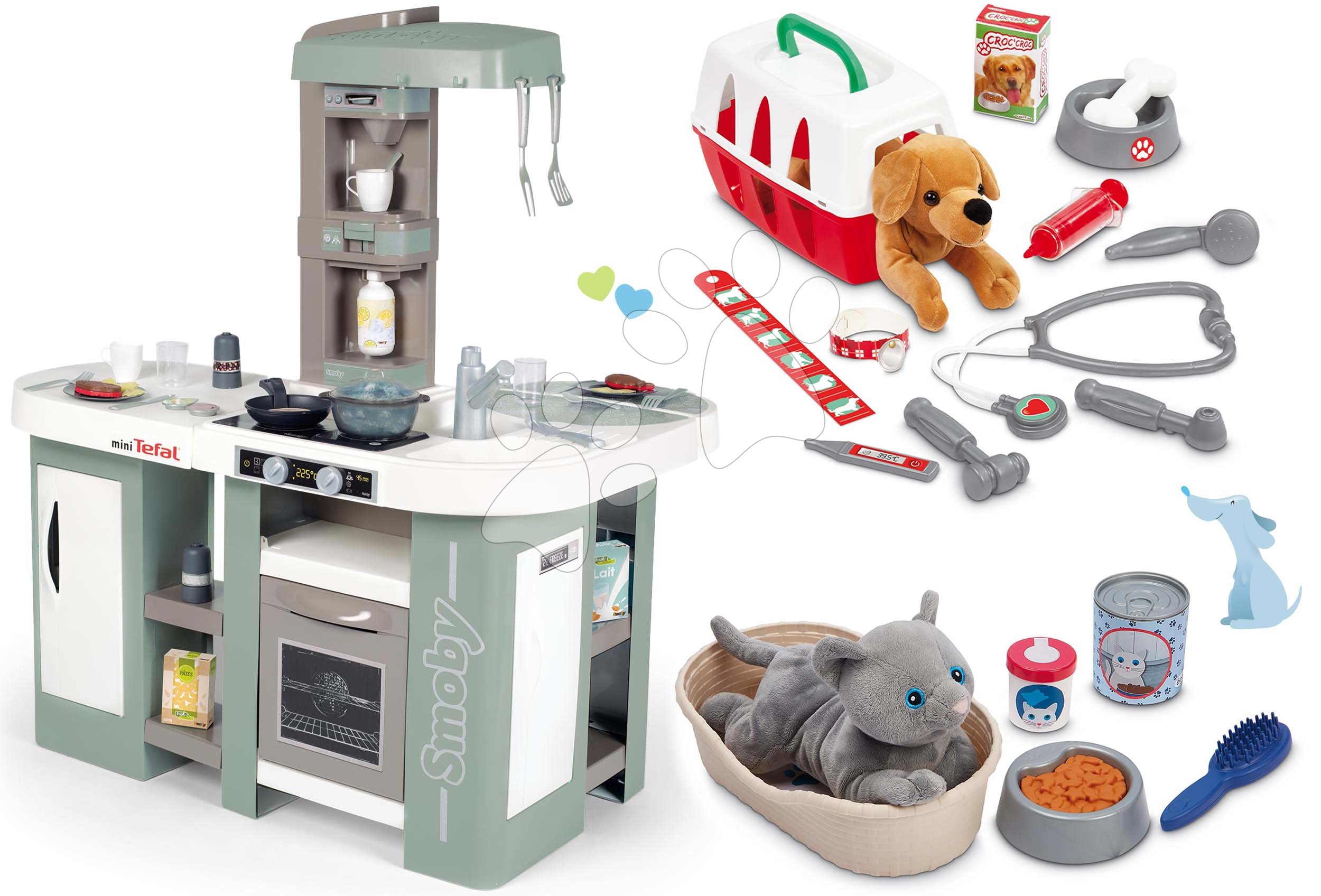 Kuchynka elektronická s bublaním Tefal XL Bubble s pelechom pre mačičku a veterinárskou klinikou predstavujú fantastickú sadu hračiek pre deti už od 3 rokov. Hračky v sete spolu dizajnovo a farebne ladia, vydržia vašim najmenším dlhé roky. Deti sa zabavia pri hre na šéfkuchárov, učia sa variť a takisto si vyskúšajú prácu zverolekárov a postarajú sa o svojich plyšových pacientov – psíka a mačičku. Hravým spôsobom sa približujú svetu dospelých, získajú realistické zážitky, rozvíjajú si jemnú motoriku a logické myslenie. Sada hračiek je vhodná aj pre viaceré deti, takže si zlepšujú jazykové zručnosti a ľahšie si vytvárajú sociálne väzby.