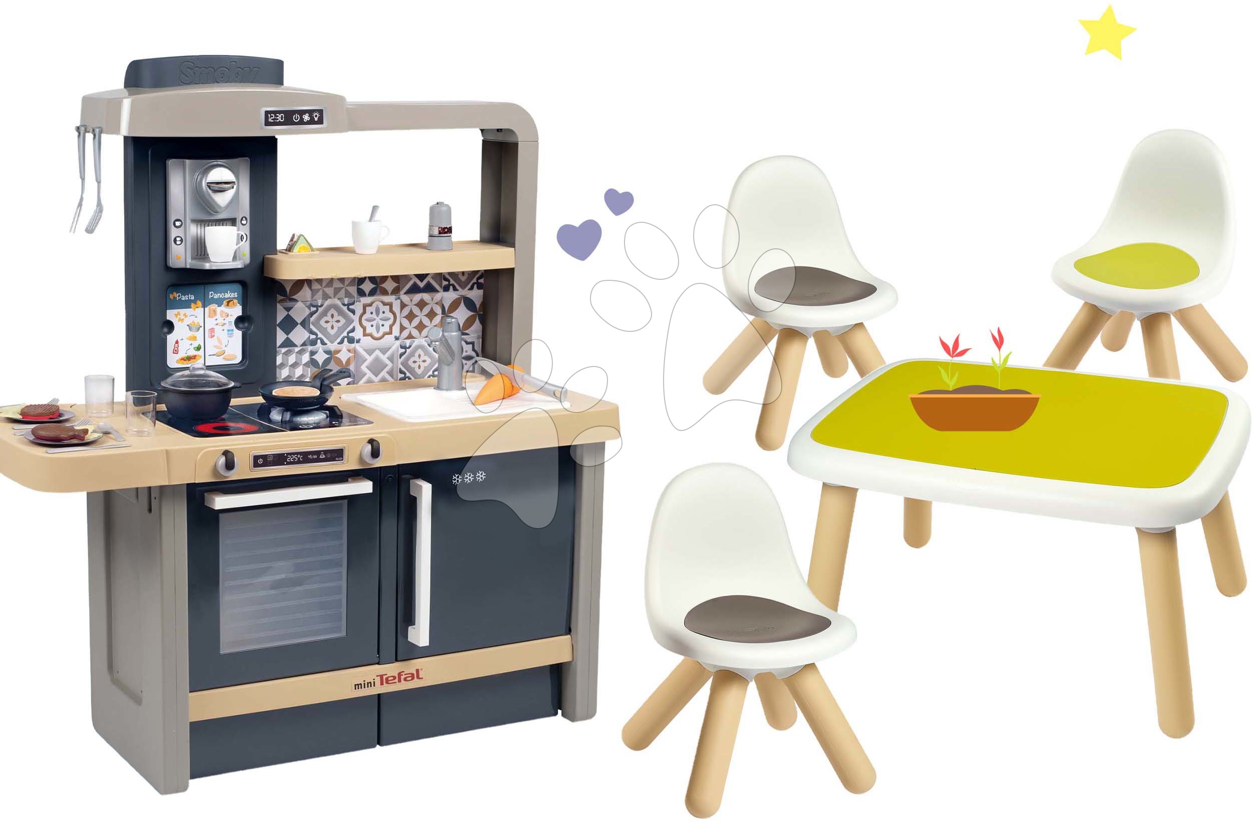 Set kuchynka elektronická s nastaviteľnou výškou Tefal Evolutive a stôl KidTable Smoby s 3 stoličkami KidChair