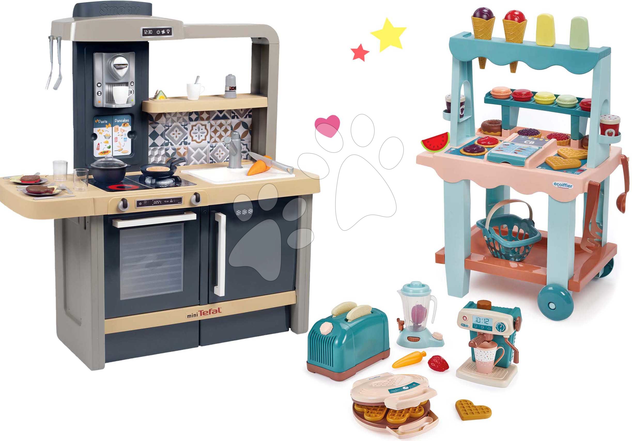 Kuchynka elektronická Tefal Evolutive a zmrzlinový stánok s vafľami a spotrebičmi spolu tvoria výnimočnú sadu hračiek pre kreatívne deti od 3 rokov. Hračky v sete spolu dizajnovo a farebne ladia, vydržia vašim najmenším dlhé roky. Výškovo prispôsobiteľná kuchynka im umožní zahrať sa na kuchárov a taktiež si vyskúšajú svoje obchodné zručnosti pri predaji sladkých pochúťok v zmrzlinovom stánku. Hravým spôsobom sa približujú svetu dospelých, získajú realistické zážitky, rozvíjajú si logické myslenie a jemnú motoriku. So sadou hračiek sa deti zahrajú so svojimi kamarátmi a súrodencami, pričom si zlepšujú komunikačné schopnosti a upevňujú sociálne väzby.