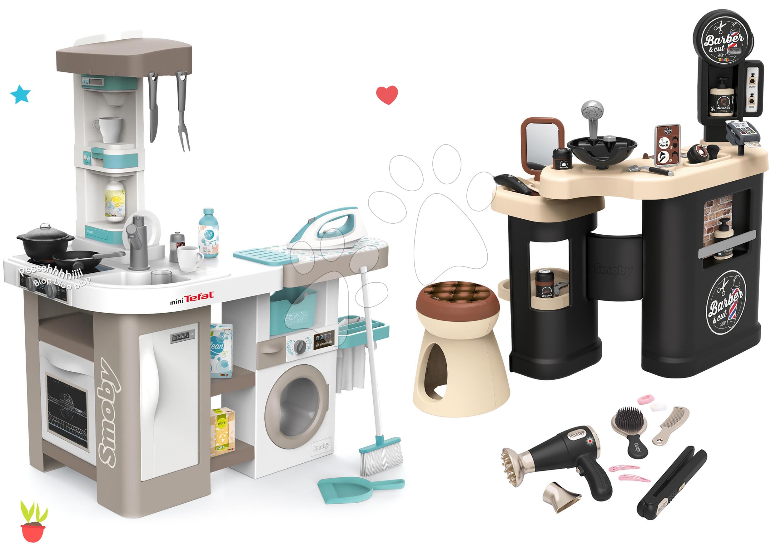 Kuchynka elektronická s práčkou, žehliacou doskou a holičstvo trojkrídlové so sušičom na vlasy spolu tvoria skvelú súpravu, ktorá poteší všetky deti už od 3 rokov. Hračky v sete spolu dizajnovo a farebne ladia, vydržia vašim najmenším dlhé roky. Chlapci a dievčatá si vyskúšajú hry na domácnosť, varia, perú, upratujú a naučia sa žehliť ako ich rodičia. Zahrajú sa aj na barberov a kaderníčky, vyskúšajú si svoju šikovnosť pri práci s kaderníckymi doplnkami, naučia sa komunikovať so zákazníkmi. Deti pri hre získajú realistické zážitky, rozvíjajú si jemnú motoriku, logické myslenie, približujú sa svetu dospelých a zlepšujú si aj jazykové schopnosti.