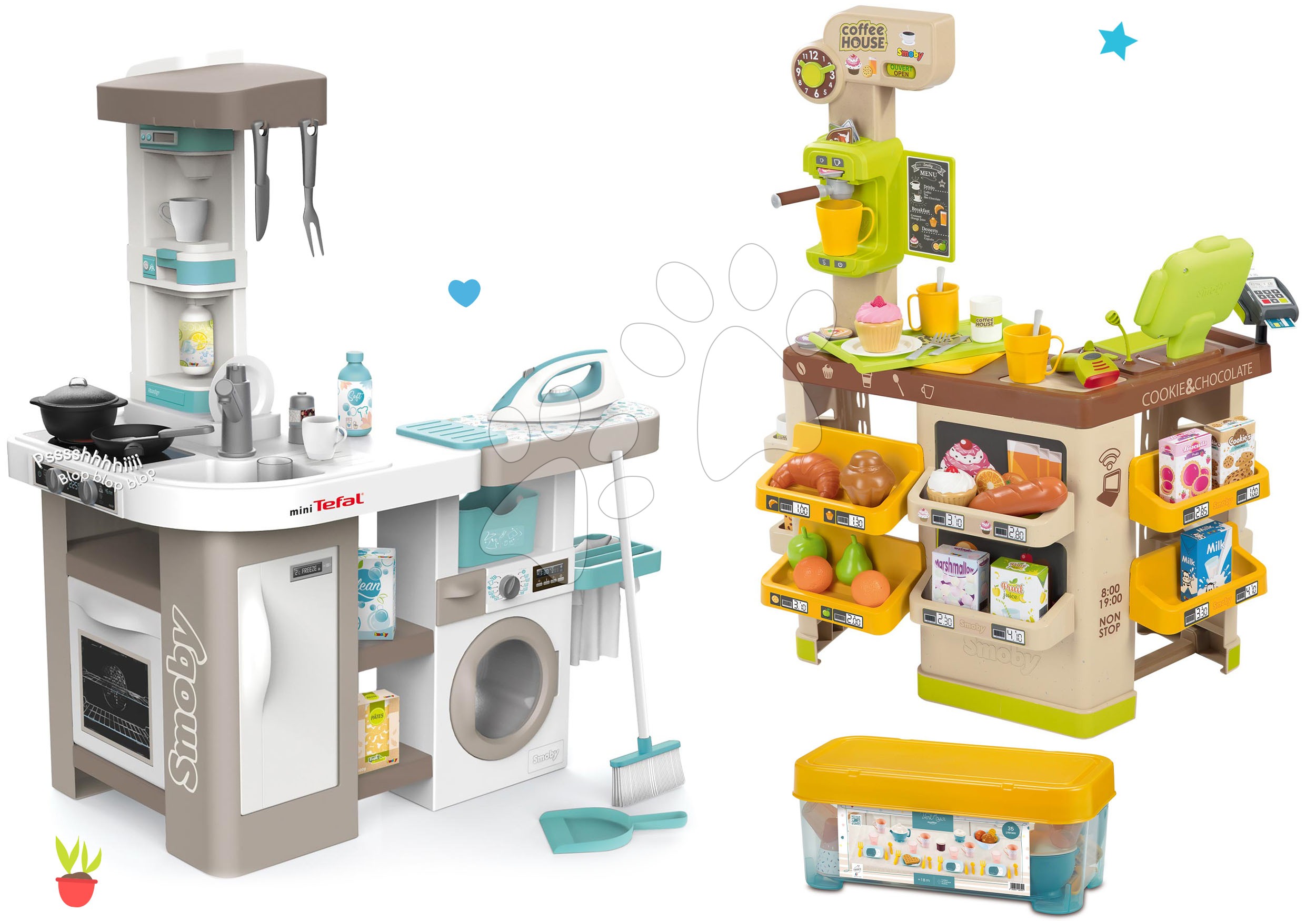 Kuchynka elektronická s práčkou, žehliacou doskou a kaviareň s espresso kávovarom a jedálenskou súpravou tvoria perfektnú sadu hračiek pre každé dieťa už od 3 rokov. Hračky v sete spolu dizajnovo a farebne ladia, vydržia vašim najmenším dlhé roky. Chlapci a dievčatá si vyskúšajú hry na domácnosť, varia, perú, upratujú a naučia sa žehliť ako ich rodičia. Zabavia sa aj pri hre na predavačov, ponúkajú zákazníkom chutnú kávu a predávajú sladké dobroty, ktoré si vychutnajú vďaka jedálenskej súprave. Deti pri hre získajú realistické zážitky, rozvíjajú si jemnú motoriku, logické myslenie, približujú sa svetu dospelých a zlepšujú si aj komunikačné schopnosti.