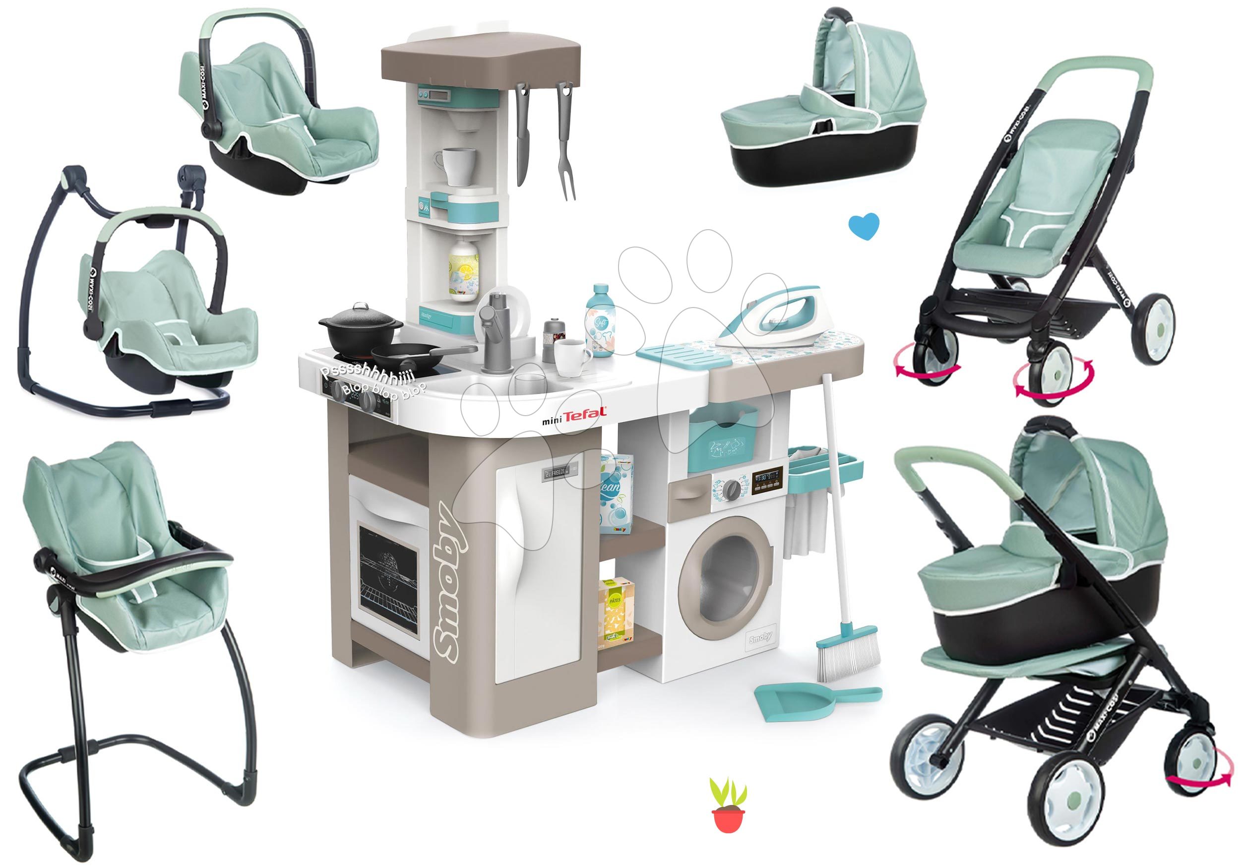 Kuchynka elektronická s práčkou, žehliacou doskou a kočík s multifunkčnou stoličkou spolu tvoria originálnu sadu hračiek pre deti už od 3 rokov. Hračky v sete spolu dizajnovo a farebne ladia, vydržia deťom dlhé roky. Chlapci aj dievčatá si vyskúšajú hry na domácnosť, varia, perú, upratujú a naučia sa žehliť ako ich rodičia. Takisto ich potešia kvalitné doplnky pre starostlivosť o bábiku, ktoré využijú doma, na výletoch, aj pri cestovaní. Vaši najmenší pri hre získajú realistické zážitky, rozvíjajú si jemnú motoriku, logické myslenie, približujú sa svetu dospelých a zlepšujú si aj komunikačné schopnosti.