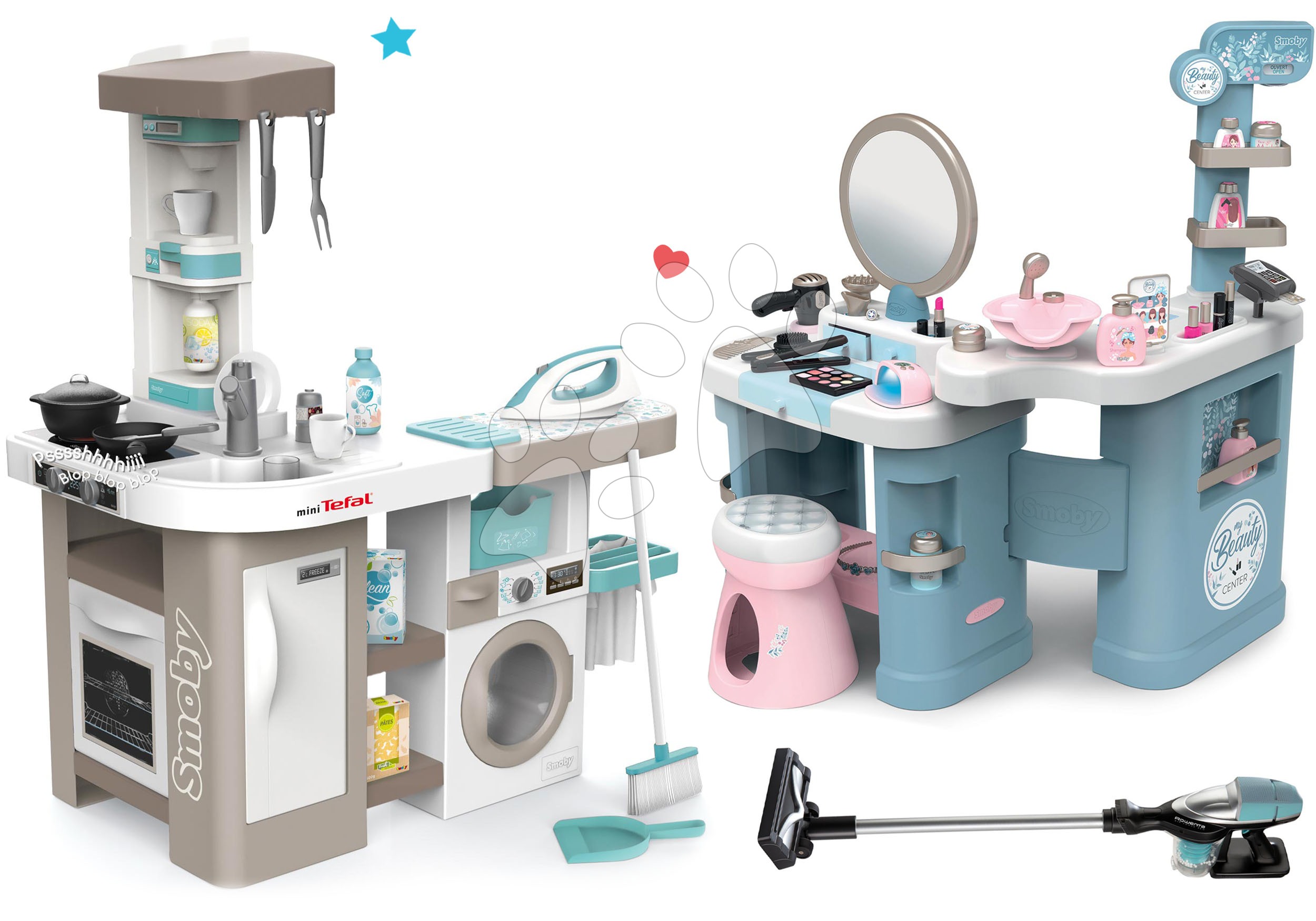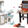 Elektronická kuchynka s práčkou a žehliacou doskou Tefal Cleaning Kitchen 360° od francúzskeho výrobcu Smoby poteší všetky deti od 3 rokov, ktorým ponúkne realistické zážitky pri varení, praní aj žehlení prádla. Multifunkčný komplex v tvare písmena L pozostáva z kuchynskej časti a práčovne, takže umožní deťom prístup zo všetkých strán, zahrajú sa s ním súrodenci aj kamaráti. Originálny francúzsky dizajn v kombinácii s jemnými pastelovými farbami očarí deti na prvý pohľad.
