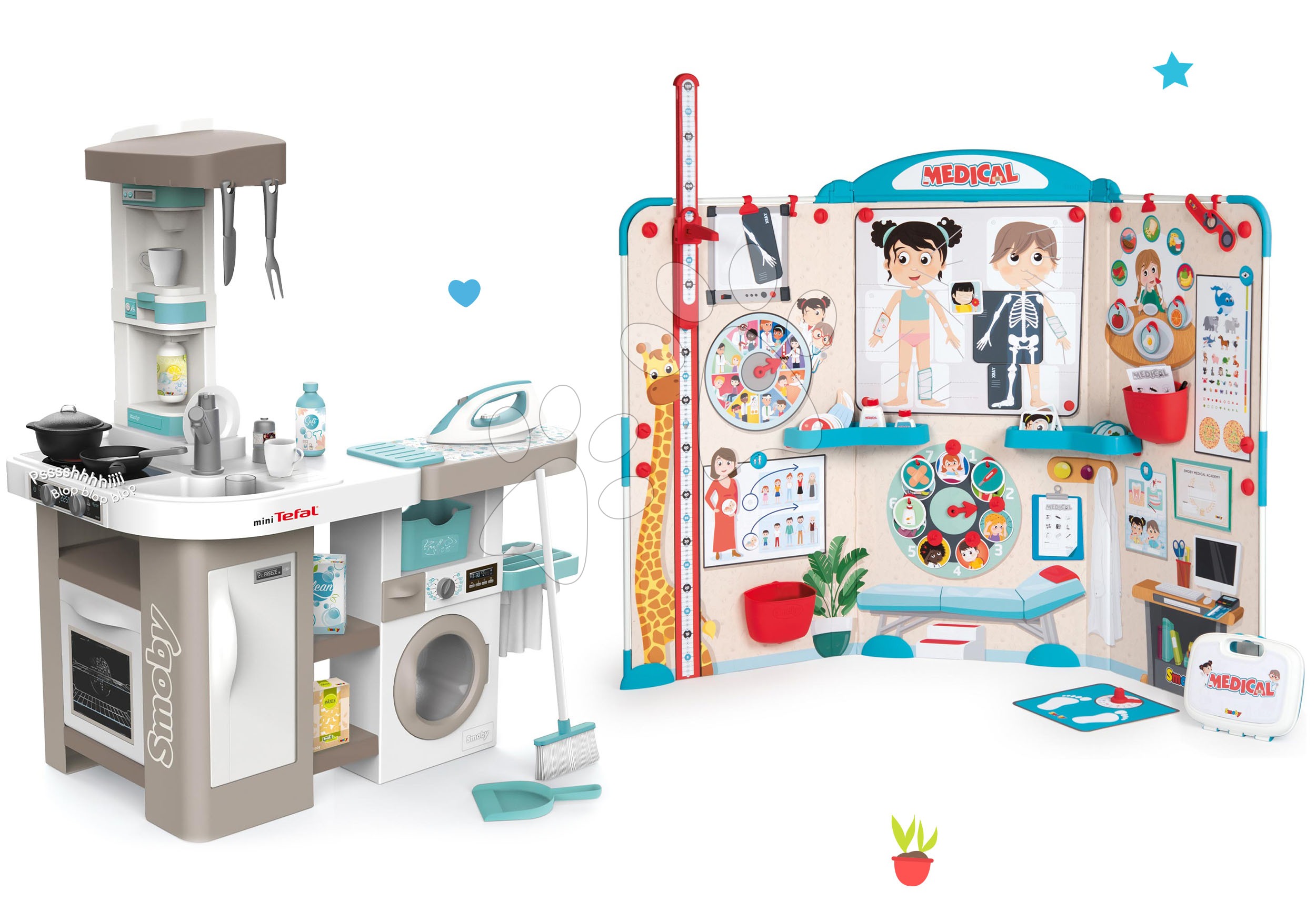 Kuchynka elektronická s práčkou, žehliacou doskou a lekárska ordinácia s anatómiou ľudského tela potešia všetky zvedavé a kreatívne deti od 3 rokov. Hračky v sete spolu dizajnovo a farebne ladia, vydržia vašim najmenším dlhé roky. Chlapci aj dievčatá si vyskúšajú hry na domácnosť, varia, perú, upratujú a naučia sa žehliť ako ich rodičia. Potešia ich aj lekárska ordinácia, s ktorou sa zahrajú na doktorov a naučia sa veľa nových informácií o ľudskom tele. Deti pri hre získajú realistické zážitky, rozvíjajú si jemnú motoriku, logické myslenie, približujú sa svetu dospelých a zlepšujú si aj komunikačné schopnosti.