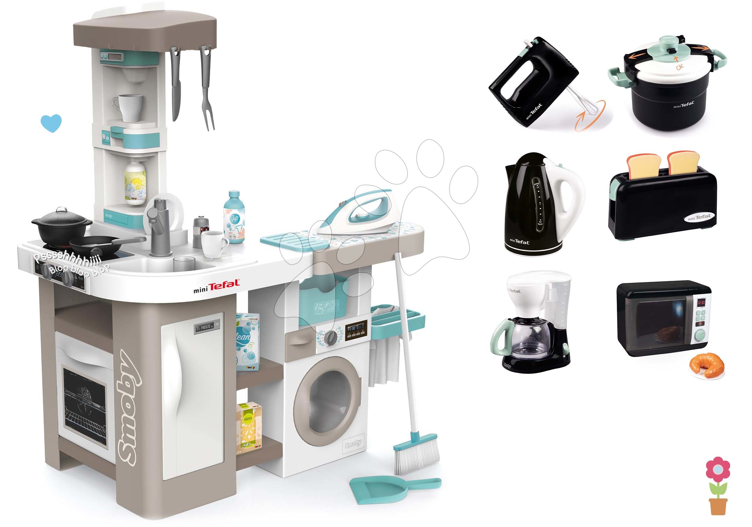 Set kuchynka elektronická s práčkou a žehliacou doskou Tefal Cleaning Kitchen 360° Smoby a mikrovlnka elektronická s mixérom tlakovým hrncom hriankovačom kanvicou a kávovarom