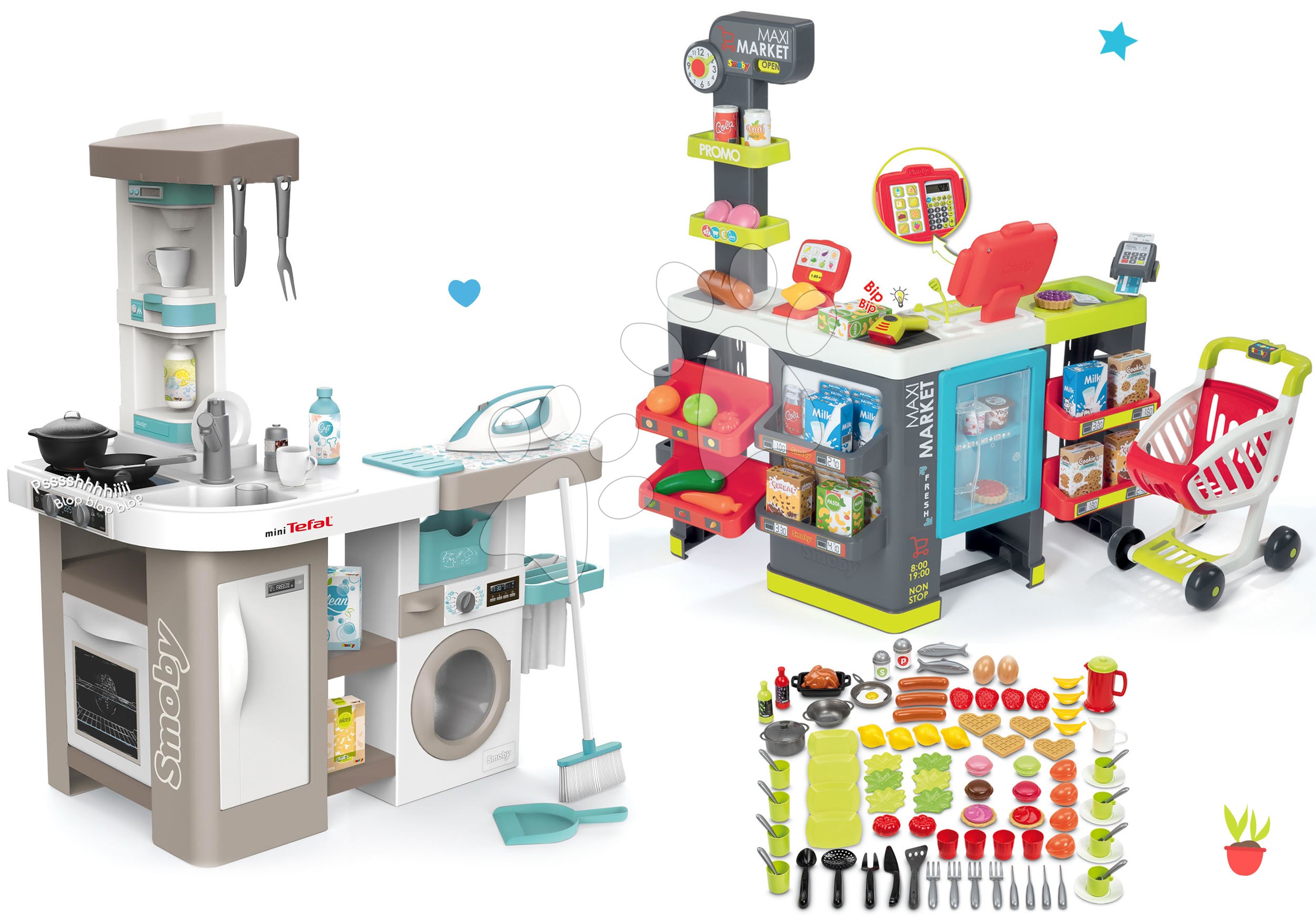 Kuchynka elektronická s práčkou, žehliacou doskou a obchod s elektronickou pokladňou a potravinami prekvapia a potešia všetky deti už od 3 rokov. Hračky v sete spolu dizajnovo a farebne ladia, vydržia vašim najmenším dlhé roky. Chlapci a dievčatá si vyskúšajú hry na domácnosť, varia, perú, upratujú a naučia sa žehliť ako ich rodičia. Zabavia sa aj pri hre na obchodníkov a predavačov, naučia sa viesť svoj vlastný obchodík a predávať tovar svojim súrodencom a kamarátom. Deti pri hre získajú realistické zážitky, rozvíjajú si jemnú motoriku, logické myslenie, približujú sa svetu dospelých a zlepšujú si aj komunikačné schopnosti.