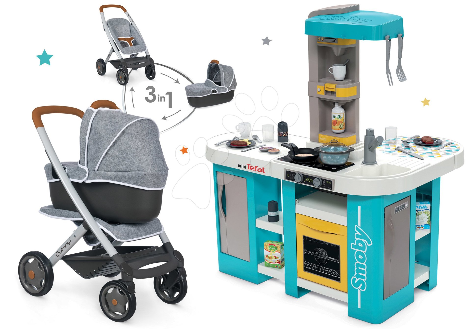 Set kuchynka elektronická Tefal Studio 360° XL Bubble Smoby a kočík hlboký a športový DeLuxe Maxi Cosi & Quinny