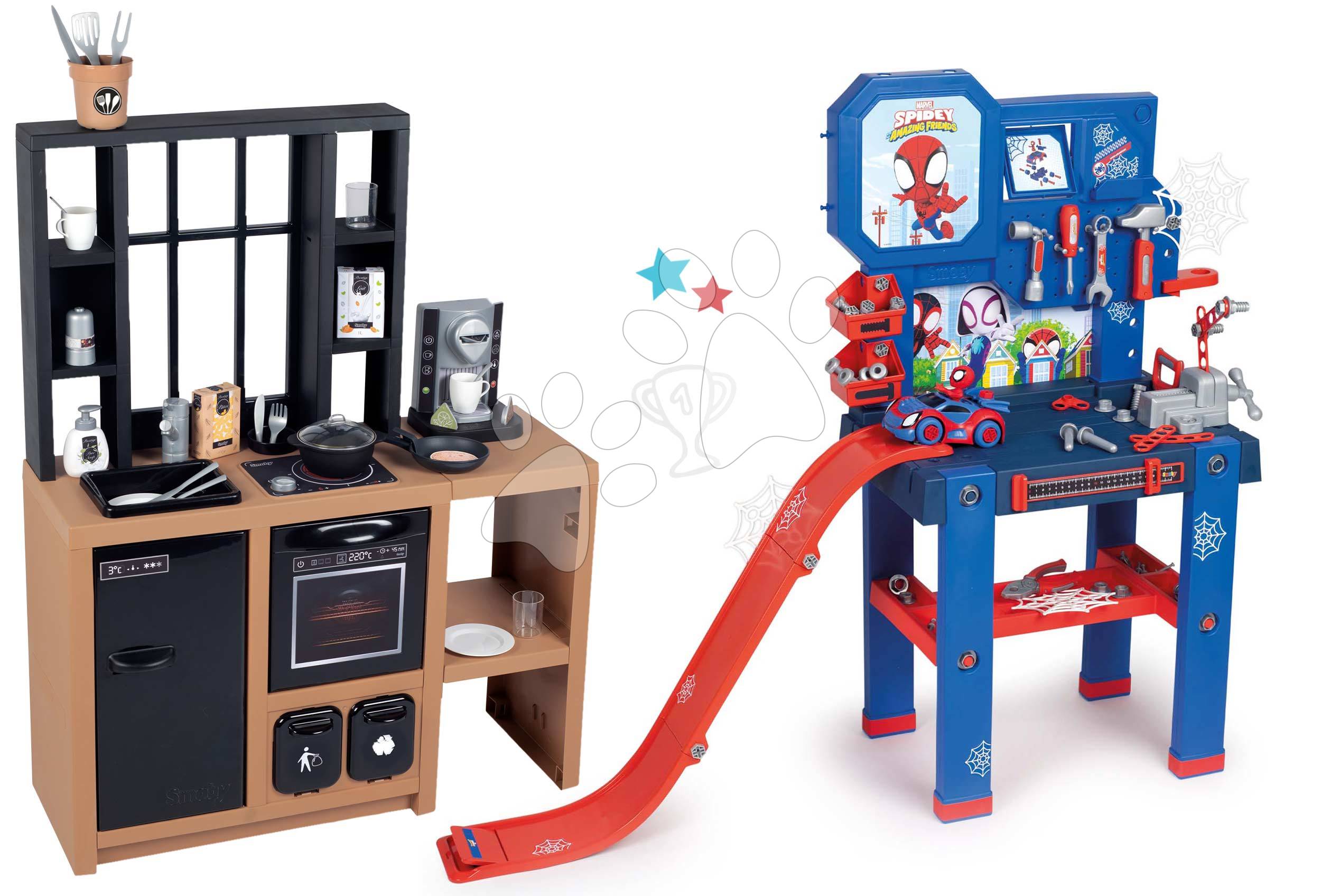Moderná kuchynka Loft Industrial a pracovná dielňa Spidey so šmykľavkou a autíčkom potešia chlapcov a dievčatá od 3 rokov. Hračky v sete spolu dizajnovo a farebne ladia, vydržia vašim najmenším dlhé roky. Dievčatá a chlapci si vyskúšajú hry na povolanie kuchárov, učia sa pripravovať chutné jedlo a taktiež zažijú skvelé zážitky v pracovnej dielni s motívom Spidey pri hre na opravárov. Hravým spôsobom sa približujú svetu dospelých, získajú realistické zážitky, rozvíjajú si jemnú motoriku a logické myslenie. Set hračiek je vhodný aj pre viaceré deti, takže si zlepšujú komunikačné schopnosti a ľahšie si vytvárajú sociálne väzby.