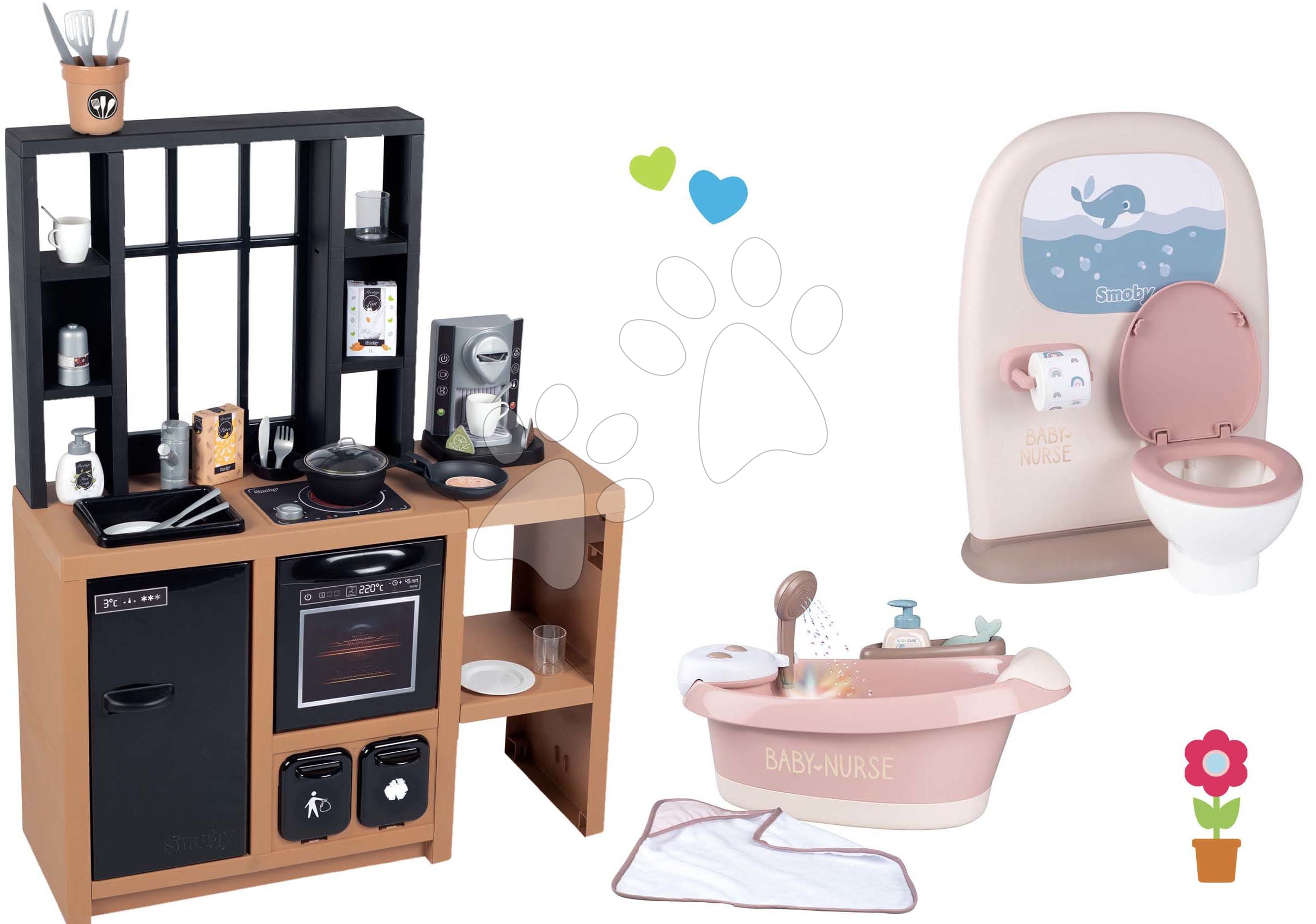 Set kuchynka moderná Loft Industrial a záchod s kúpeľňou pre bábiky Smoby a vanička s tečúcou vodou a bublaním