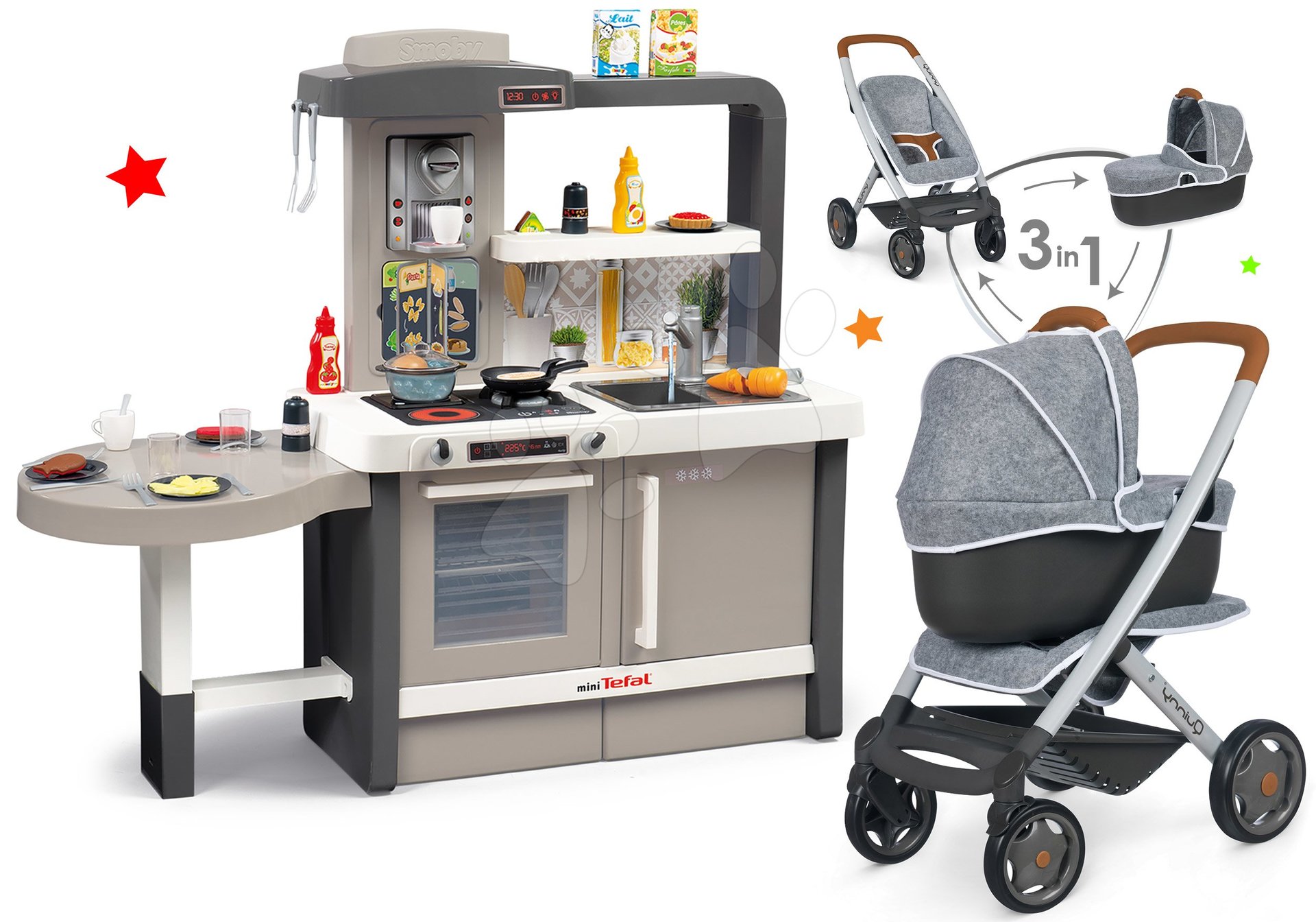 Rastúca kuchynka s tečúcou vodou a kočík hlboký a športový DeLuxe sú špičkové hračky, ktoré zaujmú chlapcov aj dievčatá už od 3 rokov. Sadu hračiek ponúkame za zvýhodnenú cenu, takže poteší nielen deti, ale aj rodičov, ktorí výrazne ušetria. Hračky v sete spolu dizajnovo a farebne ladia, ozdobia každú detskú izbičku. Deti sa zahrajú na šéfkuchárov a zároveň povozia svoje bábiky v novom kočíku, vďaka čomu sa približujú svetu dospelých a rozvíjajú si svoje logické myslenie, fantáziu a predstavivosť. Francúzsky Smoby po dlhé roky prináša deťom hračky najvyššej kvality s prvotriednym vzhľadom.