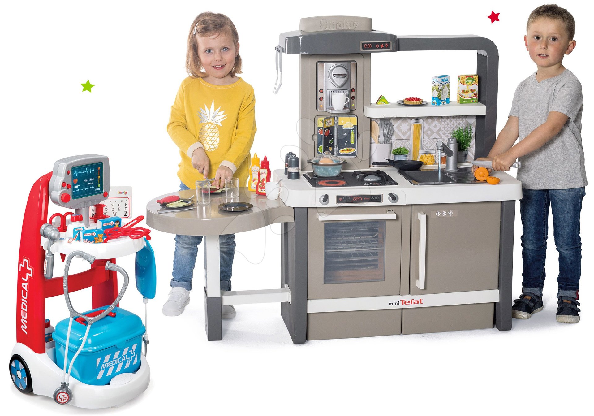 Rastúca kuchynka s tečúcou vodou a lekársky vozík elektronický s kufríkom je fantastická súprava hračiek pre všetky deti od 3 rokov. Sadu hračiek ponúkame za zníženú cenu, takže poteší nielen deti, ale aj rodičov, ktorí ich kúpou ušetria. Hračky v sete spolu dizajnovo a farebne ladia, ozdobia každú detskú izbičku. Deti sa zahrajú na šéfkuchárov a lekárov, vďaka čomu sa približujú svetu dospelých a rozvíjajú si svoje logické myslenie, fantáziu a predstavivosť. Francúzsky Smoby po dlhé roky prináša deťom hračky najvyššej kvality s prvotriednym vzhľadom.
