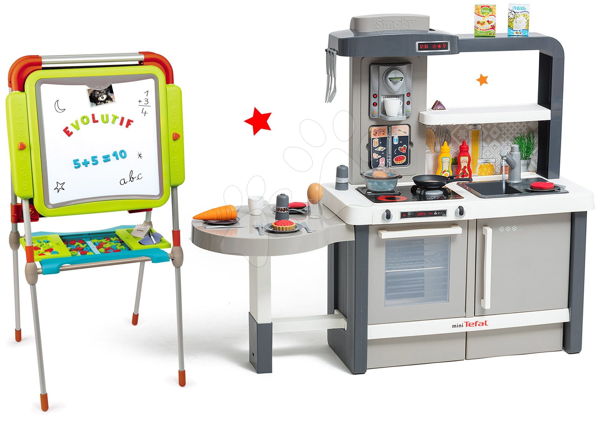 Rastúca kuchynka s tečúcou vodou Evolutive a tabuľa na kreslenie s magnetkami Evolutiv Board je fantastická súprava hračiek deti už od 3 rokov. Sadu hračiek máme v ponuke za zníženú cenu, takže poteší nielen deti, ale aj rodičov, ktorí ušetria. Hračky v sete spolu dizajnovo a farebne ladia, ozdobia každú detskú izbičku. Deti sa zahrajú na kuchárov a umelcov, vďaka čomu sa približujú svetu dospelých a rozvíjajú si svoje logické myslenie, fantáziu a predstavivosť. Francúzsky Smoby prináša deťom radosť dlhé roky hračkami najvyššej kvality a originálnym dizajnom.