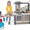 S priloženými podstavcami s výškou 8 cm ľahko nastavíte dieťaťu výšku kuchynky podľa jeho potrieb. Základná výška pracovnej dosky je 51 cm a po nasadení podstavcov je až 59 cm. Toto vylepšenie ocenia rodičia aj s viacerými deťmi v rôznom veku. Efekt tečúcej vody sa spúšťa stlačením kohútika a je vyriešený systémom uzavretého obehu, takže tečie do drezu a dostáva sa naspäť do nádržky. Chlapci a dievčatá sa zabavia aj s rúrou na pečenie, chladničkou, sporákom s varnou doskou, ale aj s listovacím receptárom s obrázkami, umiestnený priamo pod kávovarom s vkladacími kapsulami.