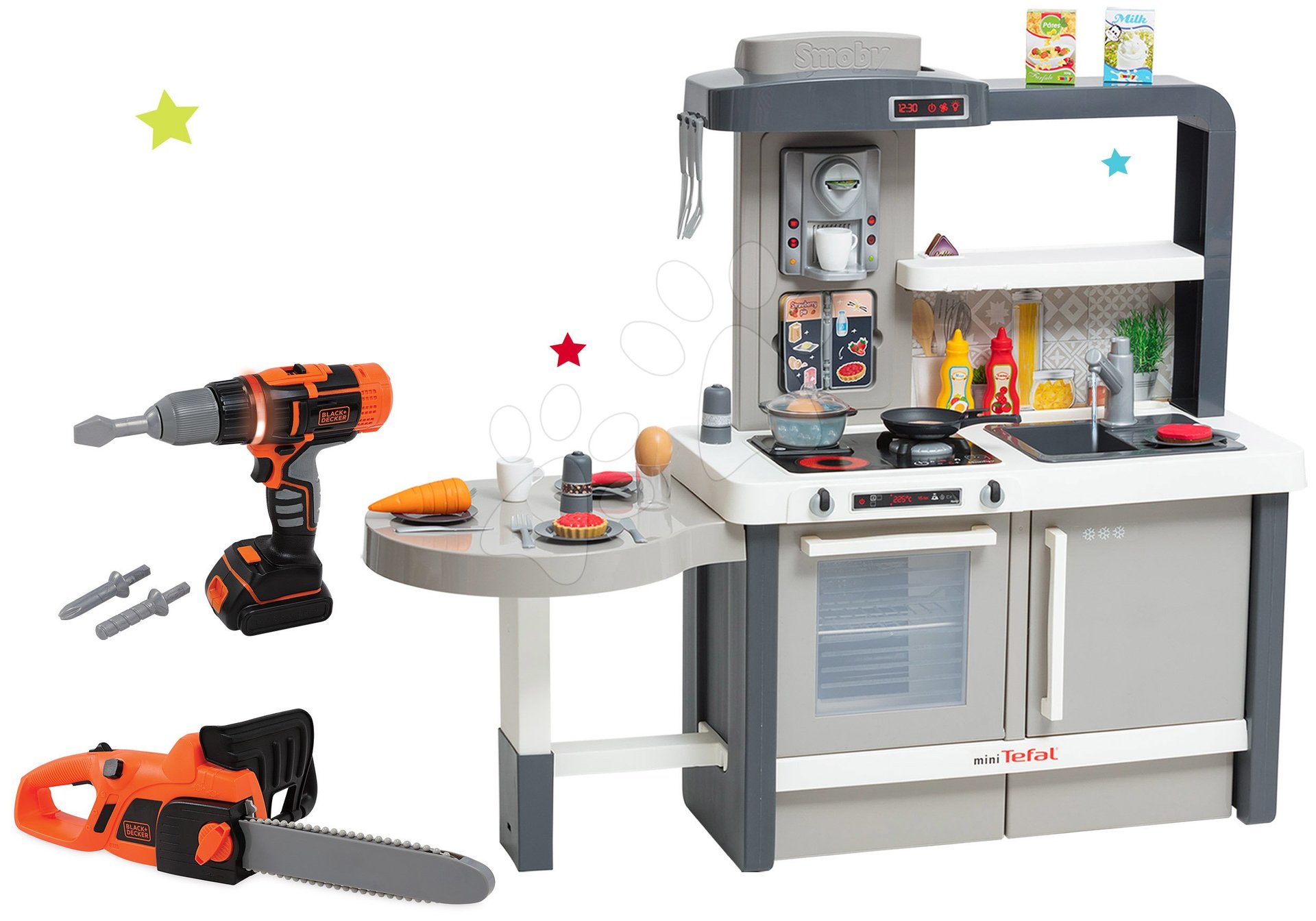 Rastúca kuchynka s tečúcou vodou, elektronická vŕtačka a motorová píla Black&Decker je fantastická súprava hračiek pre deti od 3 rokov. Sadu hračiek ponúkame za akciovú cenu, takže poteší nielen deti, ale aj rodičov, ktorí pri nákupe ušetria. Hračky v sete spolu dizajnovo a farebne ladia, ozdobia každú detskú izbičku. Deti sa zahrajú na kuchárov, opravárov a lesníkov, vďaka čomu sa približujú svetu dospelých a rozvíjajú si svoje logické myslenie, fantáziu a predstavivosť. Francúzsky Smoby už dlhé roky prináša deťom hračky najvyššej kvality s prvotriednym dizajnom.