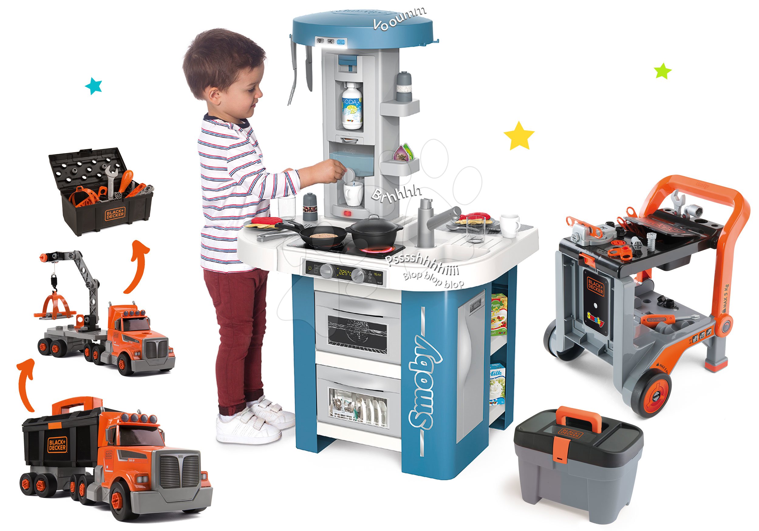 Set kuchynka s technickým vybavením Tech Edition Smoby elektronická s Black&Decker kamiónom a pracovný vozík s náradím