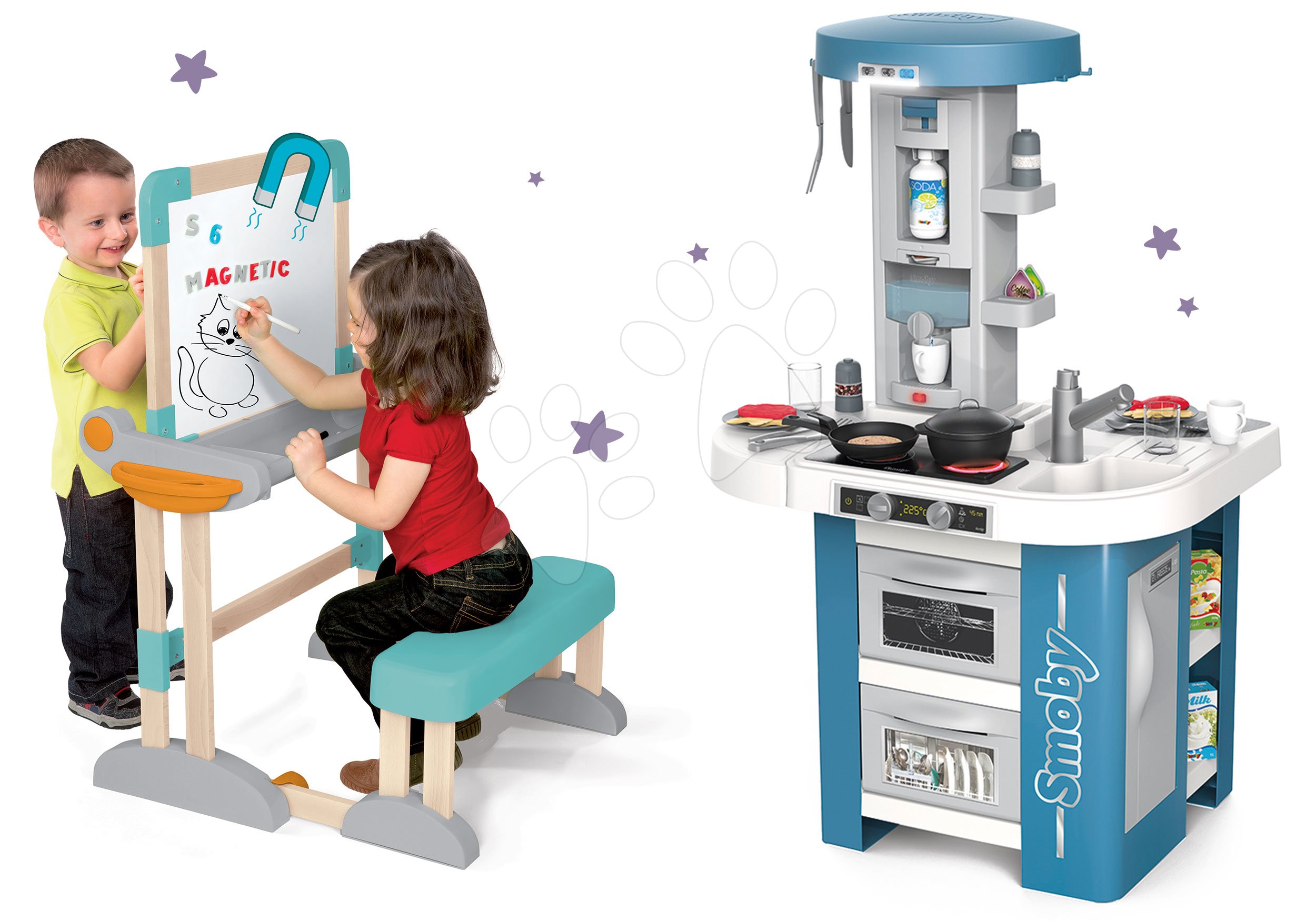 Elektronická kuchynka s technickým vybavením Tech Edition a lavica na písanie a kreslenie magnetická/na kriedu je vynikajúca voľba pre všetky zvedavé a neposedné deti od 3 rokov. Sadu hračiek ponúkame za zníženú cenu, takže poteší nielen deti, ale aj rodičov, ktorí ušetria. Hračky Smoby farebne aj dizajnovo ladia, ozdobia každú detskú izbičku a zabaví sa s nimi viacero detí, kamaráti aj súrodenci. Zahrajú sa na šéfkuchárov, učiteľov a žiakov, hravým spôsobom sa približujú svetu dospelých. Pri hre na povolania si rozvíjajú logické myslenie, technickú predstavivosť a jemnú motoriku.