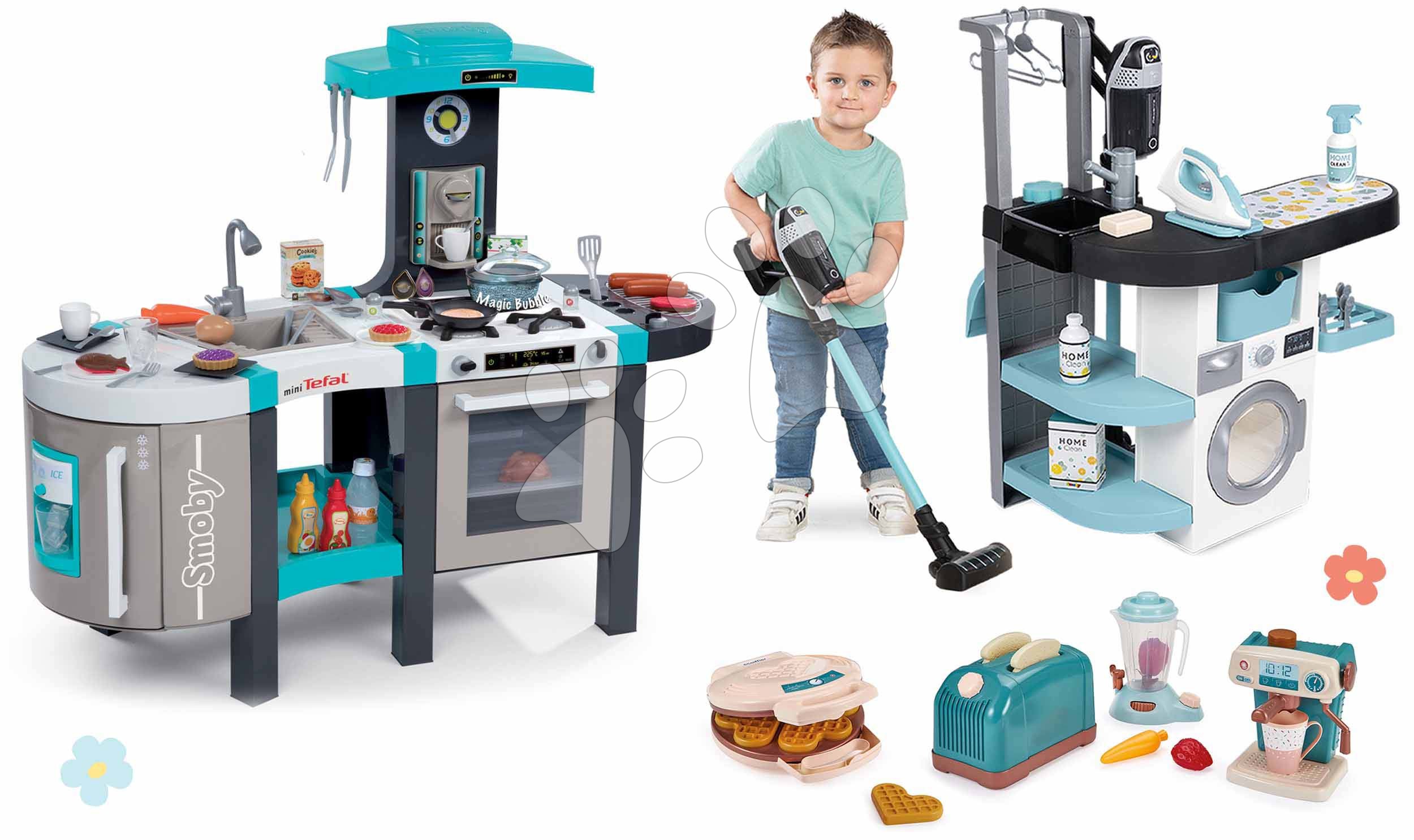 Set práčovňa s práčkou s predným plnením a kuchynka s bublaním Rowenta Wash&Clean Smoby a kuchynské spotrebiče s elektronickým vysávačom so zvukom