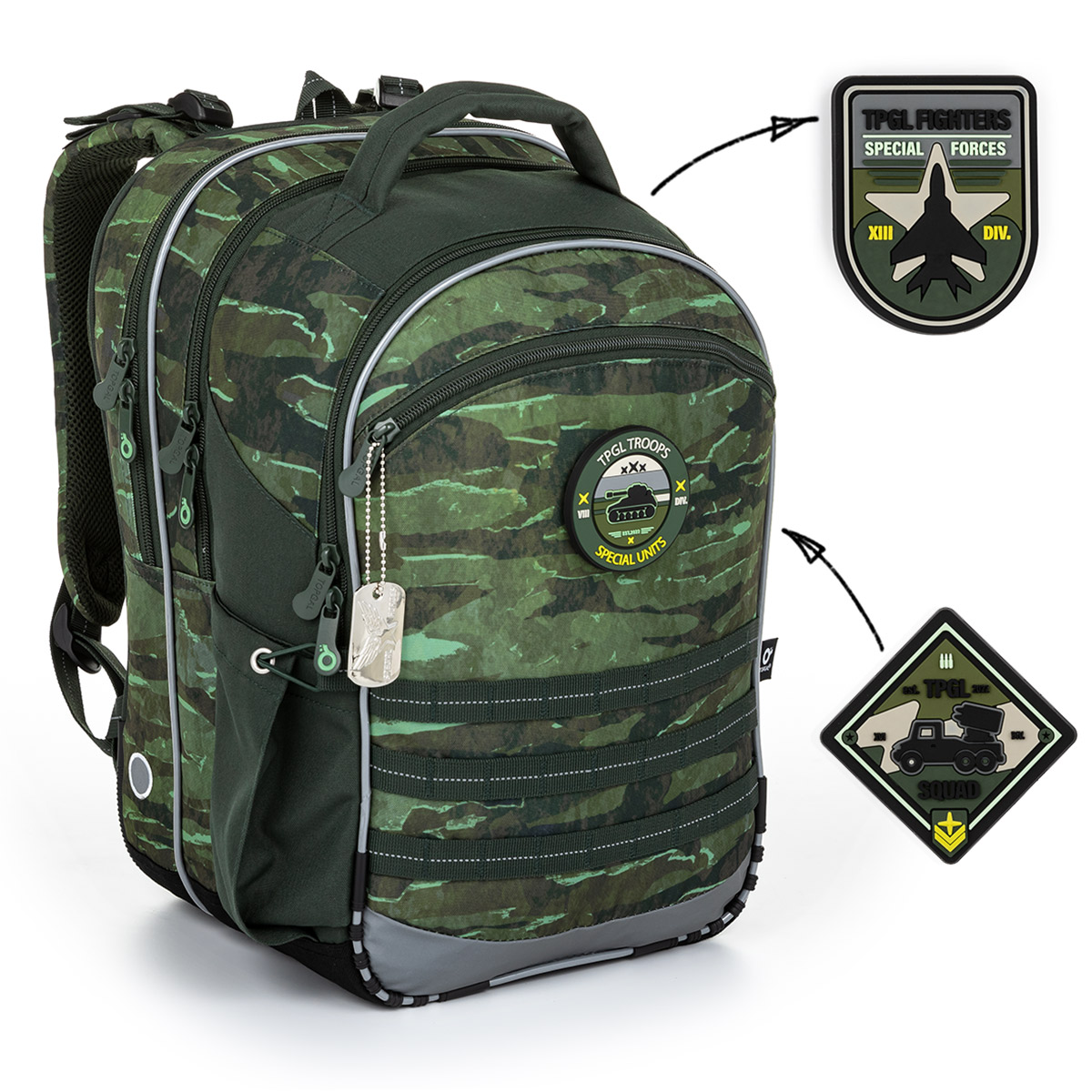 Trojkomorový model COCO je obľúbeným strihom pre malých chlapcov na prvom stupni, ale aj školákov vo vyšších ročníkoch základných škôl. Taške dominuje visačka s vojenskou pečiatkou a hravé magnetky s vojenskou tematikou. A ak vás magnetky nezaujmú? Dajú sa ľahko odpojiť bez toho, aby narušili celkový dizajn batohu.